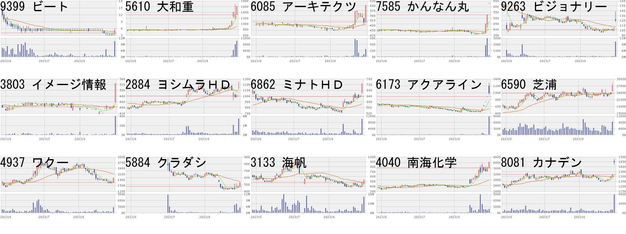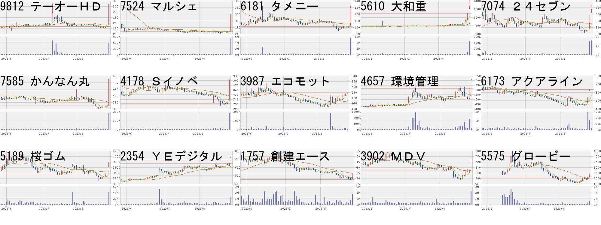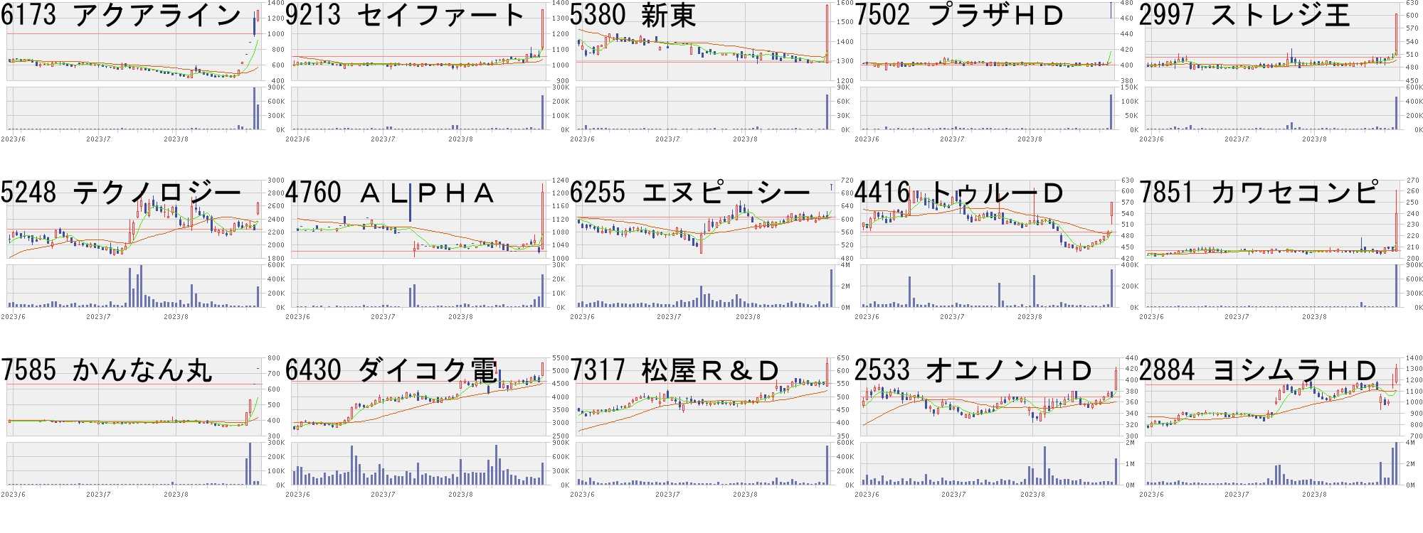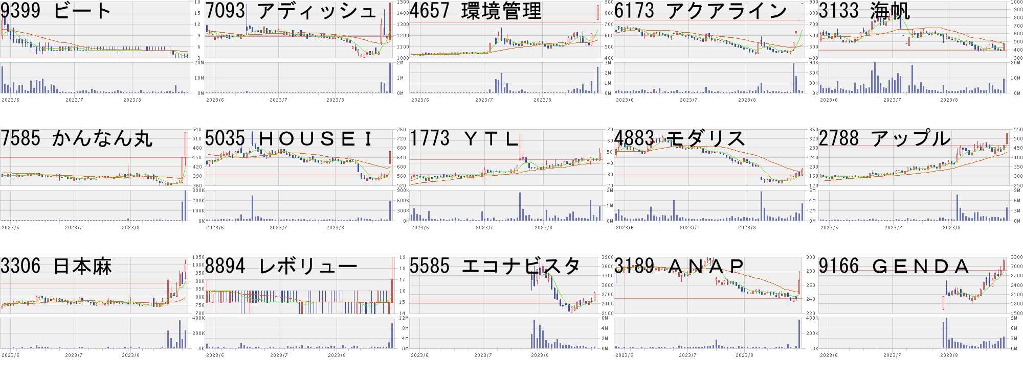 コード,銘柄名,市場,株価,前日比,前日比.1,出来高,PER,PBR,利回り6173,アクアライン,東G,1300,300,+30.00%,522500,25.6,337.0,-9213,セイファート,東S,1352,300,+28.52%,236700,10.0,1.64,3.115380,新東,東S,1585,291,+22.49%,73300,17.3,0.34,2.377502,プラザHD,東S,480,80,+20.00%,121400,115,3.02,2.082997,ストレジ王,東G,603,100,+19.88%,451200,9.8,1.3,-5248,テクノロジー,東G,2649,411,+18.36%,286100,84.9,9.53,-4760,ALPHA,東S,1202,182,+17.84%,22800,-,1.15,2.506255,エヌピーシー,東G,706,100,+16.50%,3501000,16.0,2.04,0.854416,トゥルーD,東G,570,80,+16.33%,350700,43.4,2.9,-7851,カワセコンピ,東S,240,33,+15.94%,892600,558,0.47,-7585,かんなん丸,東S,730,100,+15.87%,24900,-,3.26,-6430,ダイコク電,東P,5300,700,+15.22%,460600,26.1,2.18,0.947317,松屋R&D,東G,627,77,+14.00%,547000,25.0,3.26,0.202533,オエノンHD,東P,417,48,+13.01%,1230000,13.5,1.24,1.682884,ヨシムラHD,東P,1300,145,+12.55%,3985000,41.1,4.0,-コード,銘柄名,市場,株価,前日比,前日比.1,出来高,PER,PBR,利回り3856,Aバランス,東S,4095,-700,-14.60%,3776500,10.1,5.40,-2160,ジーエヌアイ,東G,2140,-258,-10.76%,16190300,59.7,4.42,-4883,モダリス,東G,169,-15,-8.15%,2073100,-,2.12,-1434,JESCO,東S,641,-54,-7.77%,427200,3.5,0.78,4.684657,環境管理,東S,730,-61,-7.71%,2469900,28.7,1.62,0.689812,テーオーHD,東S,303,-23,-7.06%,996200,12.1,5.90,-6029,アトラG,東S,247,-18,-6.79%,490100,29.0,1.94,-2998,クリアル,東G,5890,-400,-6.36%,131900,71.3,10.32,-7375,リファバスG,東G,1343,-91,-6.35%,258900,8.2,81.49,-7074,24セブン,東G,385,-26,-6.33%,340900,-,20.41,-9166,GENDA,東G,2743,-180,-6.16%,1585900,26.9,7.34,-7524,マルシェ,東S,294,-19,-6.07%,1059700,-,34.23,-1773,YTL,東P,47,-3,-6.00%,268000,-,-,-9553,マイクロアド,東G,2833,-172,-5.72%,817600,37.0,8.45,-2687,CVSベイ,東S,816,-49,-5.66%,403800,19.9,1.42,2.45にほんブログ村
