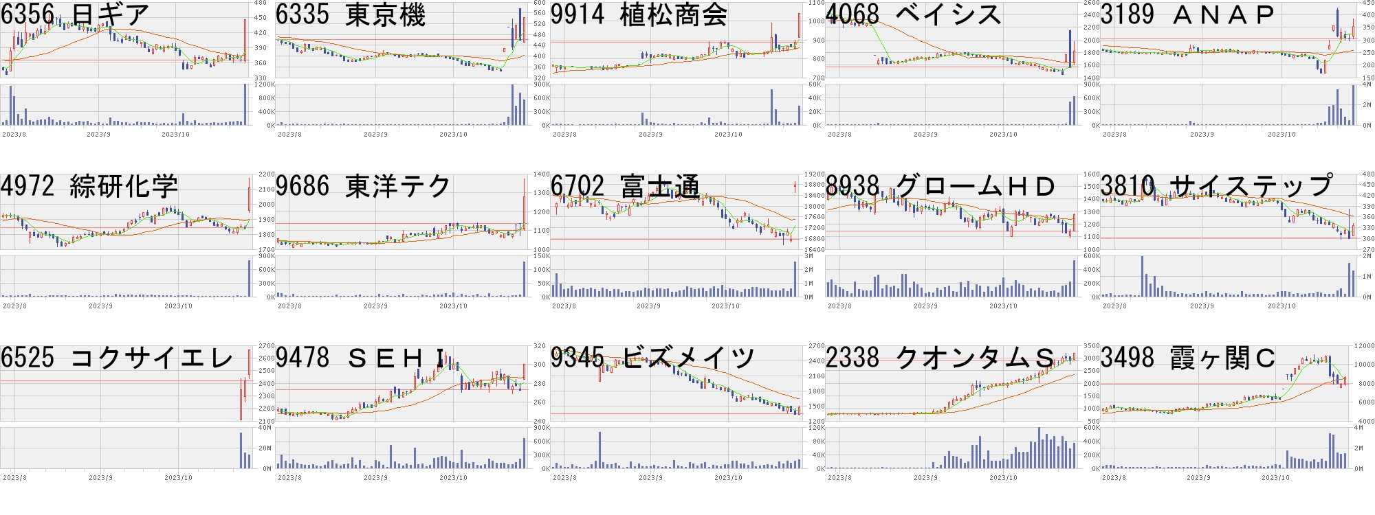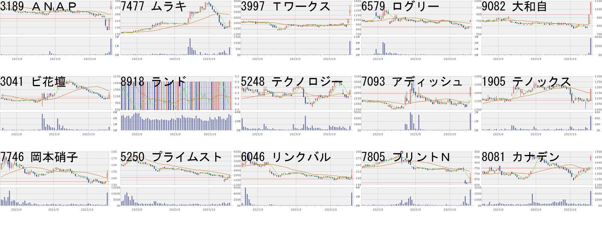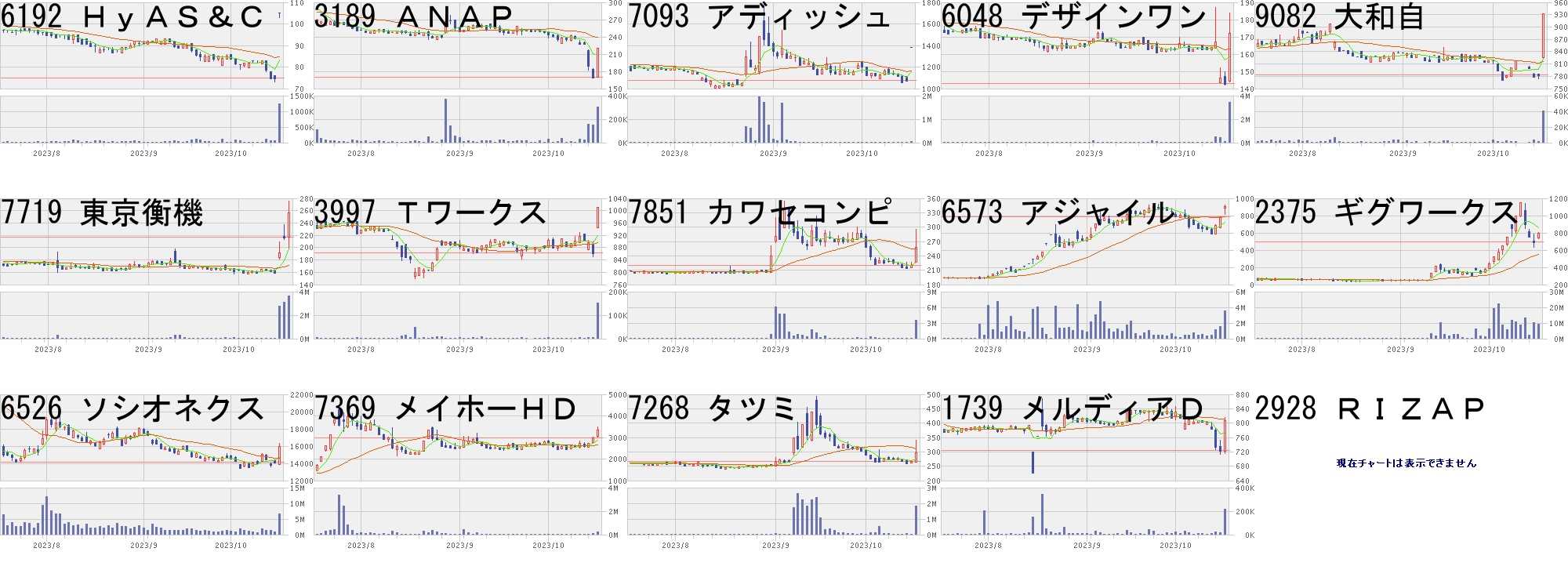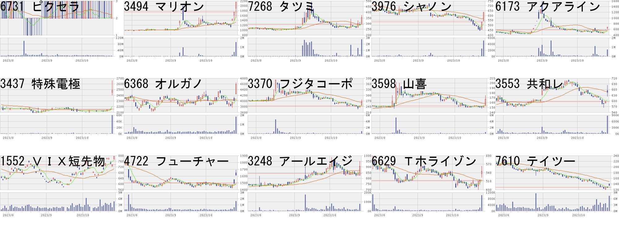 コード,銘柄名,市場,株価,前日比,前日比.1,出来高,PER,PBR,利回り2345,クシム,東S,406,80,+24.54%,11248000,-,1.09,-9331,キャスター,東G,2219,400,+21.99%,4341900,1413,4.32,-7986,日本ISK,東S,1670,300,+21.90%,767800,20.8,0.71,1.808011,三陽商,東P,2258,400,+21.53%,602200,9.4,0.69,3.908139,ナガホリ,東S,1519,209,+15.95%,734700,77.7,1.93,0.532375,ギグワークス,東S,747,100,+15.46%,5928700,-,5.36,-2376,サイネックス,東S,793,100,+14.43%,219800,13.9,0.59,1.896548,旅工房,東G,294,32,+12.21%,301900,-,-,-1757,創建エース,東S,30,3,+11.11%,1377800,-,6.98,-7777,3DM,東G,167,16,+10.60%,2106500,-,-,-4736,日本ラッド,東S,860,79,+10.12%,97500,17.9,1.65,1.166439,中日鋳,名M,539,47,+9.55%,1100,24.3,0.37,-6231,木村工機,東S,4045,350,+9.47%,62000,13.5,1.79,0.993046,JINSHD,東P,3410,275,+8.77%,469400,37.2,3.62,0.914891,ティムス,東G,264,21,+8.64%,601900,-,2.71,-コード,銘柄名,市場,株価,前日比,前日比.1,出来高,PER,PBR,利回り7042,アクセスHD,東S,1235,-440,-26.27%,6200,15.6,2.49,1.214015,アララ,東G,762,-150,-16.45%,2064600,-,4.7,-5259,BBDイニシ,東G,617,-100,-13.95%,92400,-,2.86,-6919,ケル,東S,1672,-218,-11.53%,163500,14.8,0.8,5.684920,日本色材,東S,2299,-293,-11.30%,101700,13.8,1.51,0.439903,カンセキ,東S,1193,-147,-10.97%,22600,-,0.8,-3042,セキュアヴェ,東G,339,-36,-9.60%,2871400,10.6,2.32,-3561,力の源HD,東P,1944,-206,-9.58%,1462900,32.1,7.64,0.723779,Jエスコム,東S,188,-19,-9.18%,1503800,-,4.51,-9211,エフ・コード,東G,1134,-105,-8.47%,76400,22.7,2.13,-9977,アオキスーパ,東S,2655,-245,-8.45%,28600,15.1,0.71,2.264264,セキュア,東G,1780,-159,-8.20%,260500,88.9,8.23,-3399,山岡家,東S,4215,-345,-7.57%,137100,36.9,7.53,0.192789,カルラ,東S,479,-39,-7.53%,398200,7.8,1.71,1.042938,オカムラ食品,東S,2262,-174,-7.14%,334500,14.3,1.77,1.50にほんブログ村