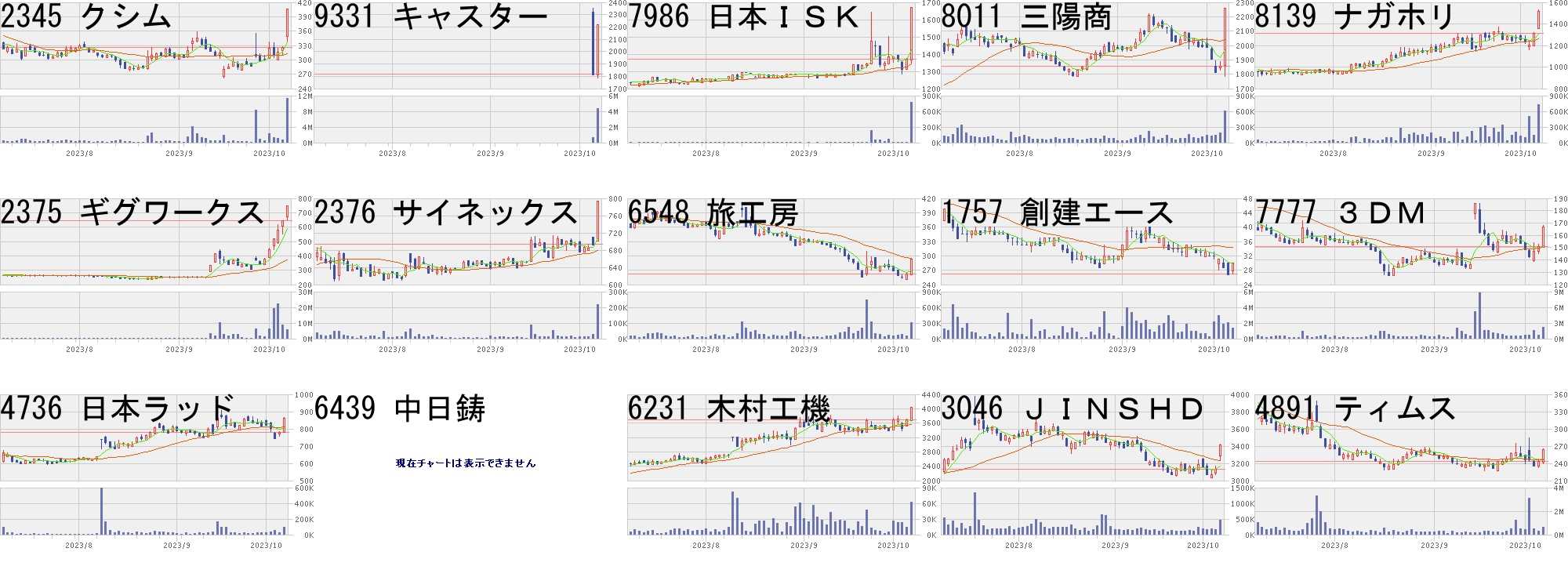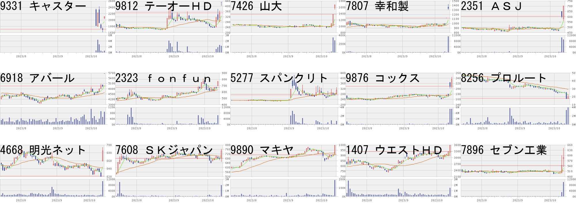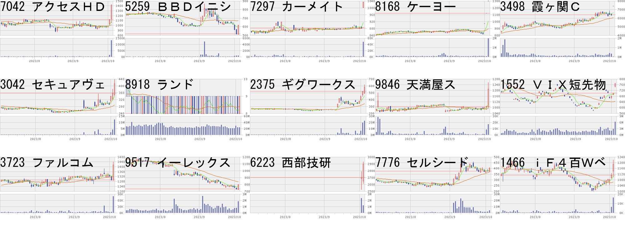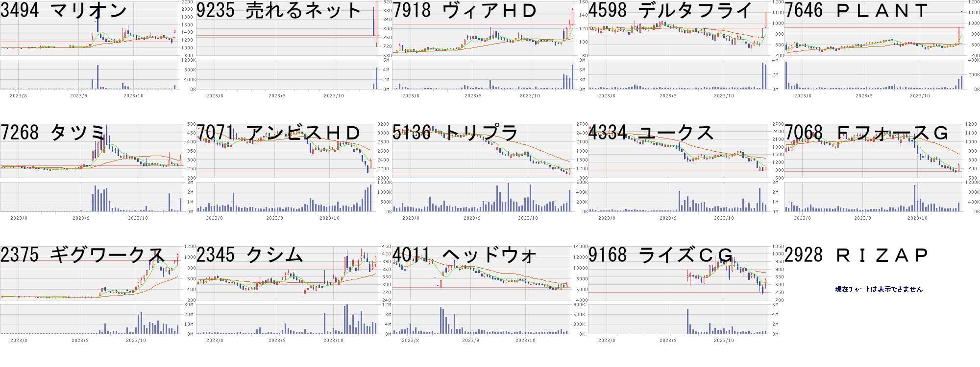 コード,銘柄名,市場,株価,前日比,前日比.1,出来高,PER,PBR,利回り2345,クシム,東S,406,80,+24.54%,11248000,-,1.09,-9331,キャスター,東G,2219,400,+21.99%,4341900,1413,4.32,-7986,日本ISK,東S,1670,300,+21.90%,767800,20.8,0.71,1.808011,三陽商,東P,2258,400,+21.53%,602200,9.4,0.69,3.908139,ナガホリ,東S,1519,209,+15.95%,734700,77.7,1.93,0.532375,ギグワークス,東S,747,100,+15.46%,5928700,-,5.36,-2376,サイネックス,東S,793,100,+14.43%,219800,13.9,0.59,1.896548,旅工房,東G,294,32,+12.21%,301900,-,-,-1757,創建エース,東S,30,3,+11.11%,1377800,-,6.98,-7777,3DM,東G,167,16,+10.60%,2106500,-,-,-4736,日本ラッド,東S,860,79,+10.12%,97500,17.9,1.65,1.166439,中日鋳,名M,539,47,+9.55%,1100,24.3,0.37,-6231,木村工機,東S,4045,350,+9.47%,62000,13.5,1.79,0.993046,JINSHD,東P,3410,275,+8.77%,469400,37.2,3.62,0.914891,ティムス,東G,264,21,+8.64%,601900,-,2.71,-コード,銘柄名,市場,株価,前日比,前日比.1,出来高,PER,PBR,利回り7042,アクセスHD,東S,1235,-440,-26.27%,6200,15.6,2.49,1.214015,アララ,東G,762,-150,-16.45%,2064600,-,4.7,-5259,BBDイニシ,東G,617,-100,-13.95%,92400,-,2.86,-6919,ケル,東S,1672,-218,-11.53%,163500,14.8,0.8,5.684920,日本色材,東S,2299,-293,-11.30%,101700,13.8,1.51,0.439903,カンセキ,東S,1193,-147,-10.97%,22600,-,0.8,-3042,セキュアヴェ,東G,339,-36,-9.60%,2871400,10.6,2.32,-3561,力の源HD,東P,1944,-206,-9.58%,1462900,32.1,7.64,0.723779,Jエスコム,東S,188,-19,-9.18%,1503800,-,4.51,-9211,エフ・コード,東G,1134,-105,-8.47%,76400,22.7,2.13,-9977,アオキスーパ,東S,2655,-245,-8.45%,28600,15.1,0.71,2.264264,セキュア,東G,1780,-159,-8.20%,260500,88.9,8.23,-3399,山岡家,東S,4215,-345,-7.57%,137100,36.9,7.53,0.192789,カルラ,東S,479,-39,-7.53%,398200,7.8,1.71,1.042938,オカムラ食品,東S,2262,-174,-7.14%,334500,14.3,1.77,1.50にほんブログ村