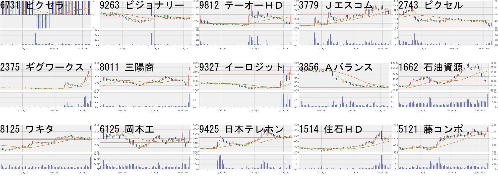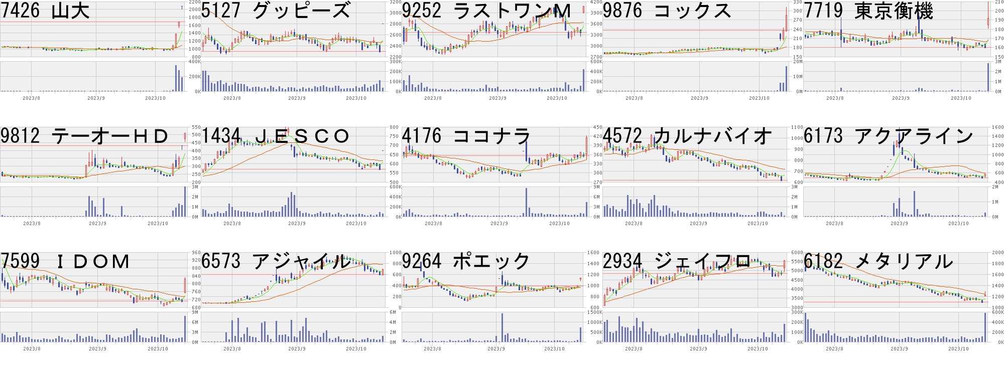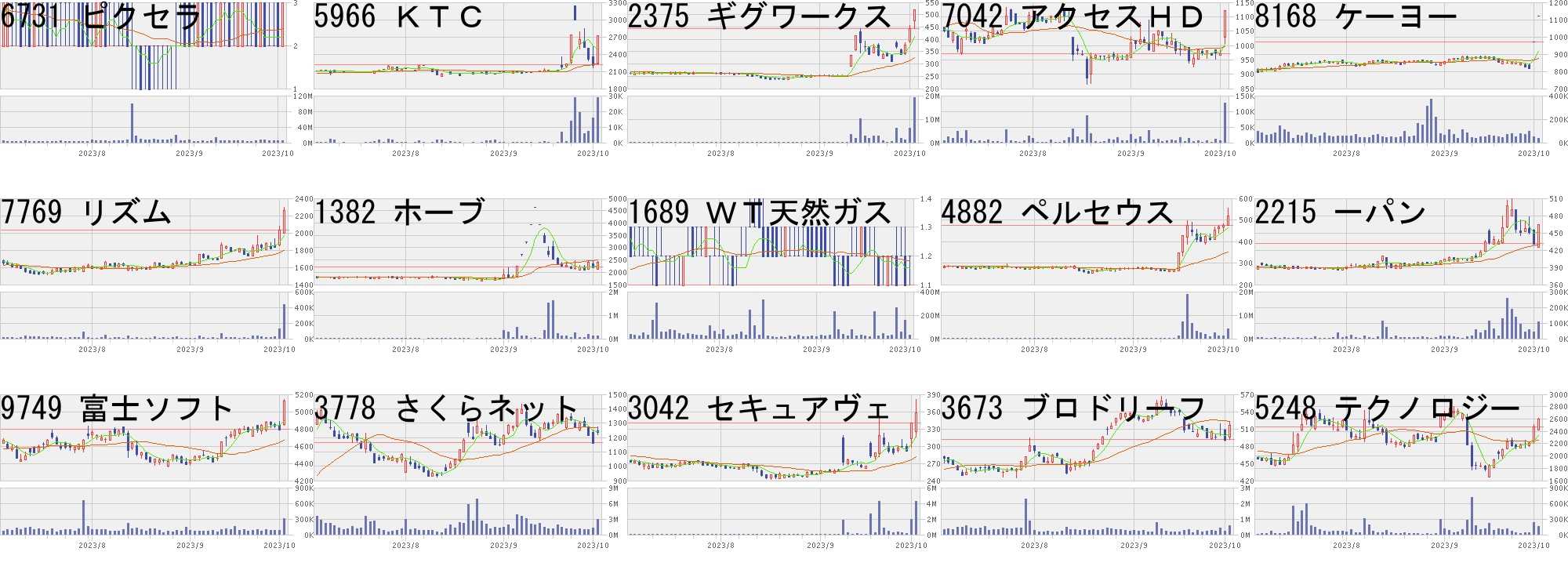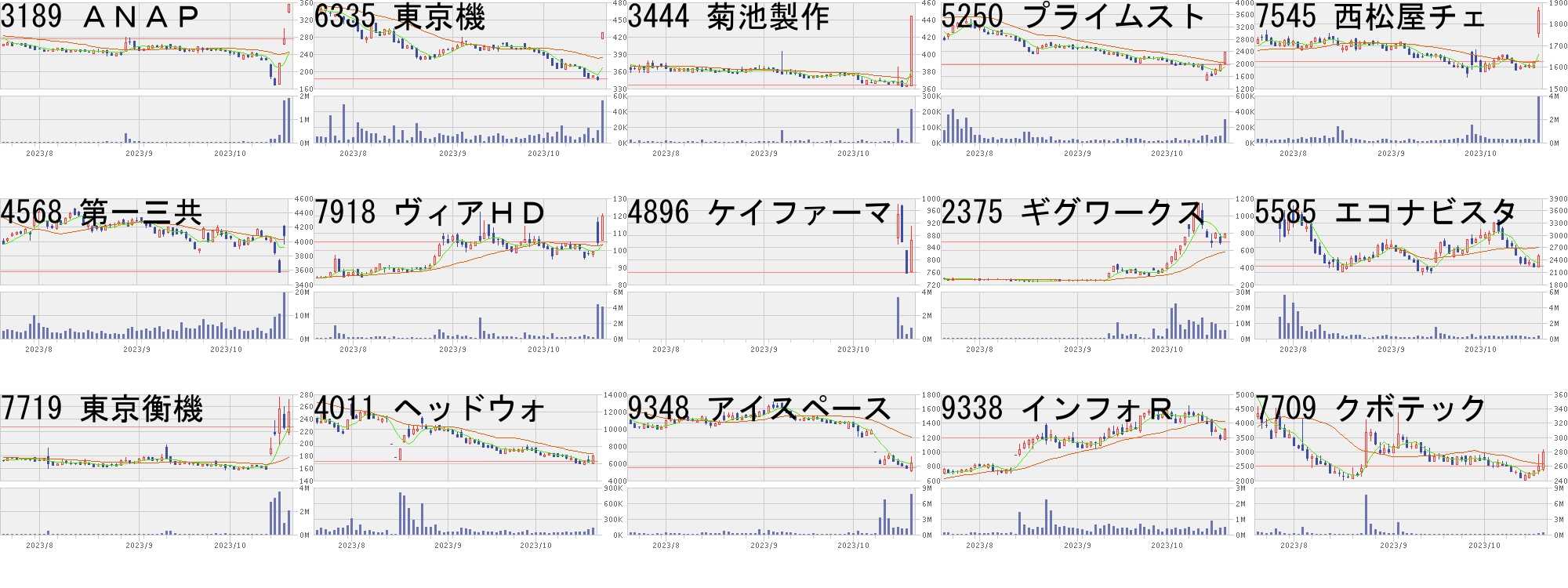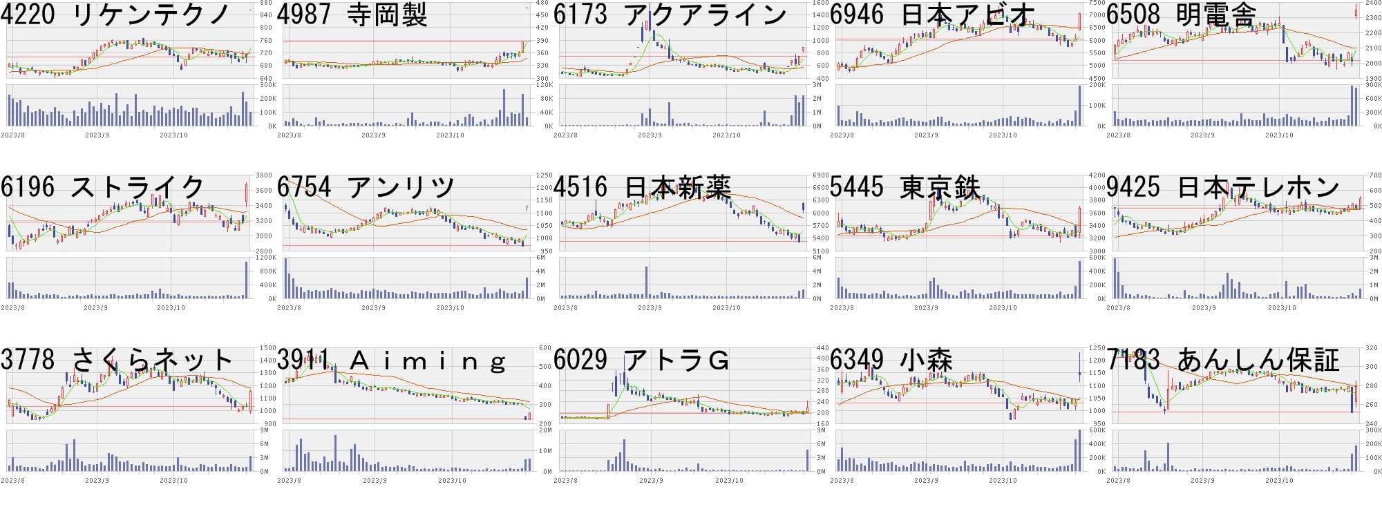 コード,銘柄名,市場,株価,前日比,前日比.1,出来高,PER,PBR,利回り2345,クシム,東S,406,80,+24.54%,11248000,-,1.09,-9331,キャスター,東G,2219,400,+21.99%,4341900,1413,4.32,-7986,日本ISK,東S,1670,300,+21.90%,767800,20.8,0.71,1.808011,三陽商,東P,2258,400,+21.53%,602200,9.4,0.69,3.908139,ナガホリ,東S,1519,209,+15.95%,734700,77.7,1.93,0.532375,ギグワークス,東S,747,100,+15.46%,5928700,-,5.36,-2376,サイネックス,東S,793,100,+14.43%,219800,13.9,0.59,1.896548,旅工房,東G,294,32,+12.21%,301900,-,-,-1757,創建エース,東S,30,3,+11.11%,1377800,-,6.98,-7777,3DM,東G,167,16,+10.60%,2106500,-,-,-4736,日本ラッド,東S,860,79,+10.12%,97500,17.9,1.65,1.166439,中日鋳,名M,539,47,+9.55%,1100,24.3,0.37,-6231,木村工機,東S,4045,350,+9.47%,62000,13.5,1.79,0.993046,JINSHD,東P,3410,275,+8.77%,469400,37.2,3.62,0.914891,ティムス,東G,264,21,+8.64%,601900,-,2.71,-コード,銘柄名,市場,株価,前日比,前日比.1,出来高,PER,PBR,利回り7042,アクセスHD,東S,1235,-440,-26.27%,6200,15.6,2.49,1.214015,アララ,東G,762,-150,-16.45%,2064600,-,4.7,-5259,BBDイニシ,東G,617,-100,-13.95%,92400,-,2.86,-6919,ケル,東S,1672,-218,-11.53%,163500,14.8,0.8,5.684920,日本色材,東S,2299,-293,-11.30%,101700,13.8,1.51,0.439903,カンセキ,東S,1193,-147,-10.97%,22600,-,0.8,-3042,セキュアヴェ,東G,339,-36,-9.60%,2871400,10.6,2.32,-3561,力の源HD,東P,1944,-206,-9.58%,1462900,32.1,7.64,0.723779,Jエスコム,東S,188,-19,-9.18%,1503800,-,4.51,-9211,エフ・コード,東G,1134,-105,-8.47%,76400,22.7,2.13,-9977,アオキスーパ,東S,2655,-245,-8.45%,28600,15.1,0.71,2.264264,セキュア,東G,1780,-159,-8.20%,260500,88.9,8.23,-3399,山岡家,東S,4215,-345,-7.57%,137100,36.9,7.53,0.192789,カルラ,東S,479,-39,-7.53%,398200,7.8,1.71,1.042938,オカムラ食品,東S,2262,-174,-7.14%,334500,14.3,1.77,1.50にほんブログ村
