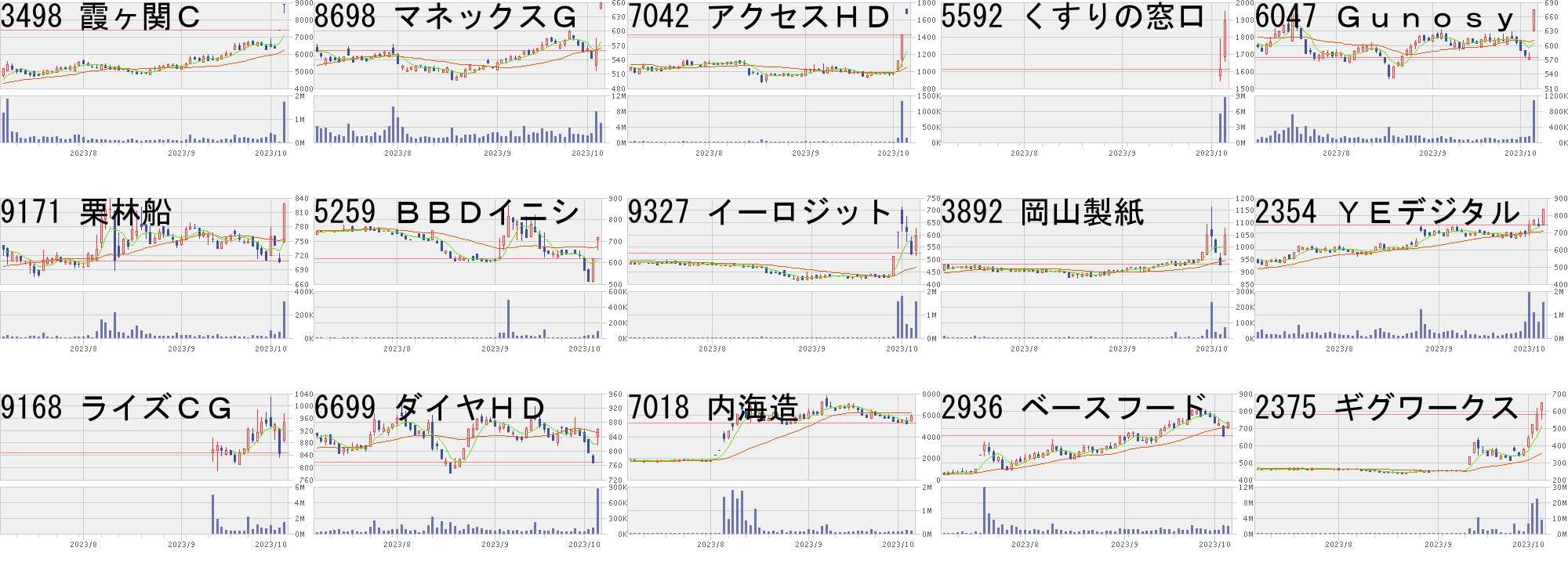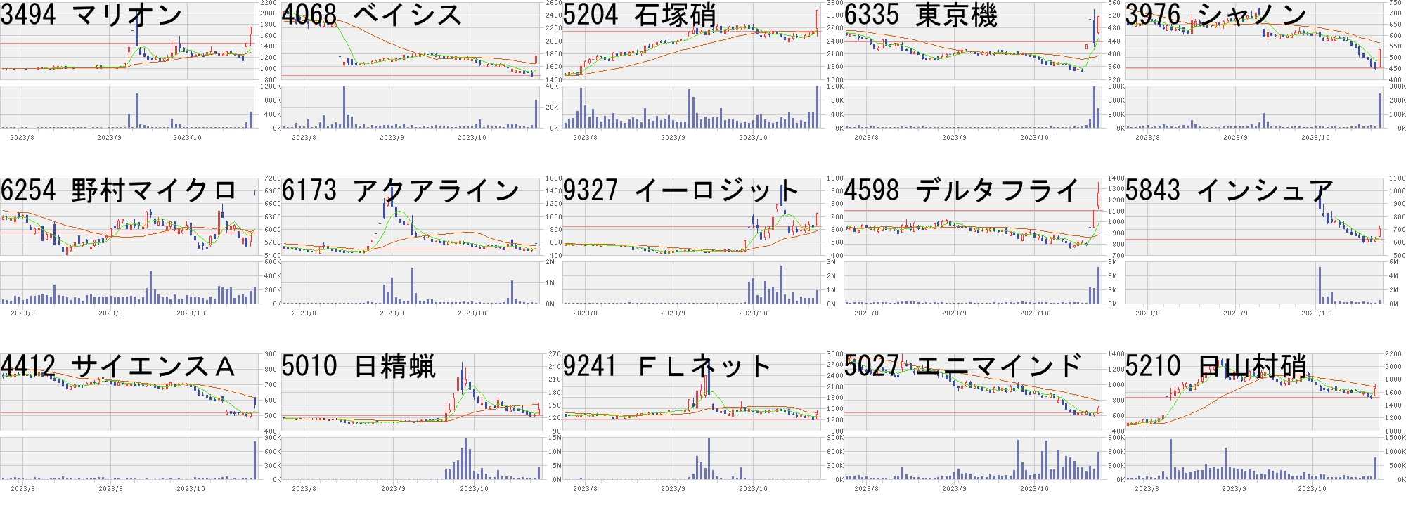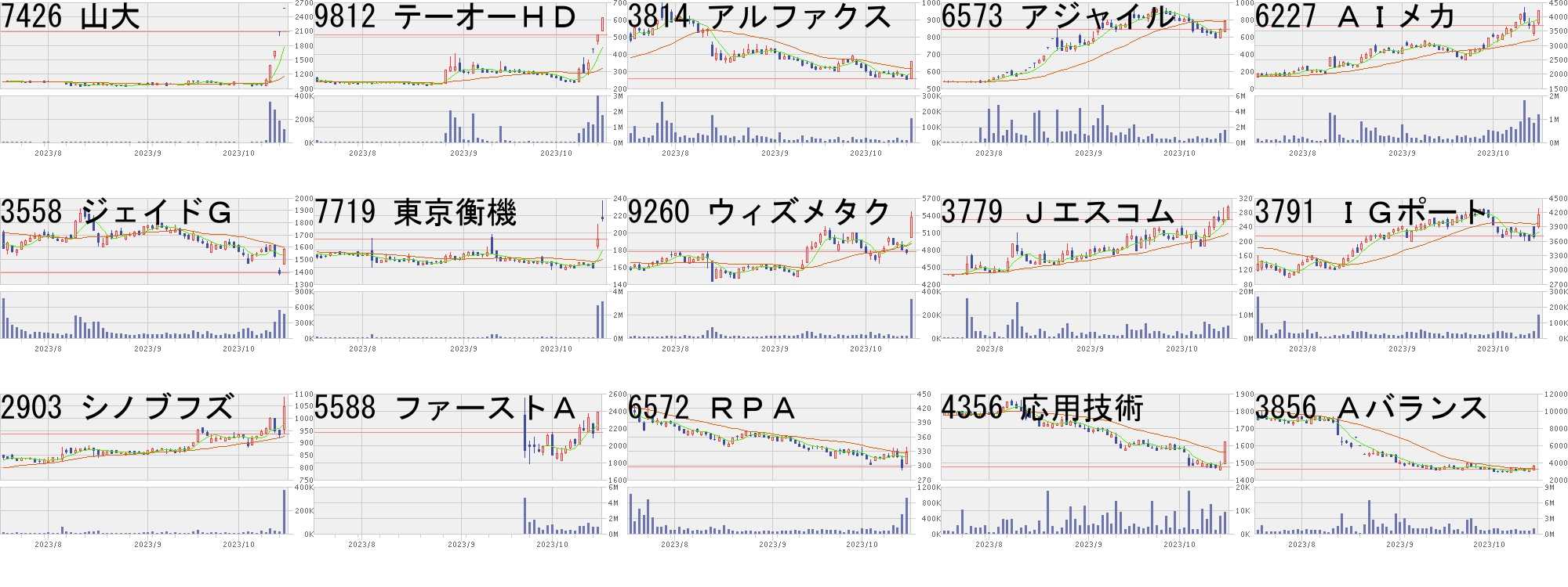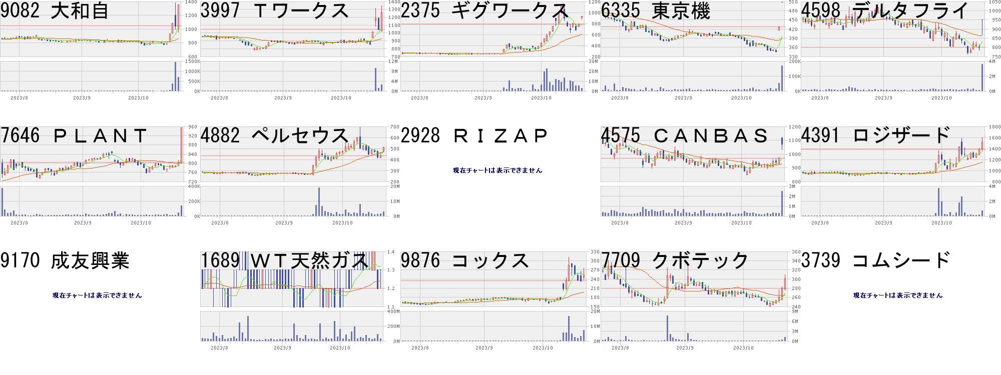 コード,銘柄名,市場,株価,前日比,前日比.1,出来高,PER,PBR,利回り2345,クシム,東S,406,80,+24.54%,11248000,-,1.09,-9331,キャスター,東G,2219,400,+21.99%,4341900,1413,4.32,-7986,日本ISK,東S,1670,300,+21.90%,767800,20.8,0.71,1.808011,三陽商,東P,2258,400,+21.53%,602200,9.4,0.69,3.908139,ナガホリ,東S,1519,209,+15.95%,734700,77.7,1.93,0.532375,ギグワークス,東S,747,100,+15.46%,5928700,-,5.36,-2376,サイネックス,東S,793,100,+14.43%,219800,13.9,0.59,1.896548,旅工房,東G,294,32,+12.21%,301900,-,-,-1757,創建エース,東S,30,3,+11.11%,1377800,-,6.98,-7777,3DM,東G,167,16,+10.60%,2106500,-,-,-4736,日本ラッド,東S,860,79,+10.12%,97500,17.9,1.65,1.166439,中日鋳,名M,539,47,+9.55%,1100,24.3,0.37,-6231,木村工機,東S,4045,350,+9.47%,62000,13.5,1.79,0.993046,JINSHD,東P,3410,275,+8.77%,469400,37.2,3.62,0.914891,ティムス,東G,264,21,+8.64%,601900,-,2.71,-コード,銘柄名,市場,株価,前日比,前日比.1,出来高,PER,PBR,利回り7042,アクセスHD,東S,1235,-440,-26.27%,6200,15.6,2.49,1.214015,アララ,東G,762,-150,-16.45%,2064600,-,4.7,-5259,BBDイニシ,東G,617,-100,-13.95%,92400,-,2.86,-6919,ケル,東S,1672,-218,-11.53%,163500,14.8,0.8,5.684920,日本色材,東S,2299,-293,-11.30%,101700,13.8,1.51,0.439903,カンセキ,東S,1193,-147,-10.97%,22600,-,0.8,-3042,セキュアヴェ,東G,339,-36,-9.60%,2871400,10.6,2.32,-3561,力の源HD,東P,1944,-206,-9.58%,1462900,32.1,7.64,0.723779,Jエスコム,東S,188,-19,-9.18%,1503800,-,4.51,-9211,エフ・コード,東G,1134,-105,-8.47%,76400,22.7,2.13,-9977,アオキスーパ,東S,2655,-245,-8.45%,28600,15.1,0.71,2.264264,セキュア,東G,1780,-159,-8.20%,260500,88.9,8.23,-3399,山岡家,東S,4215,-345,-7.57%,137100,36.9,7.53,0.192789,カルラ,東S,479,-39,-7.53%,398200,7.8,1.71,1.042938,オカムラ食品,東S,2262,-174,-7.14%,334500,14.3,1.77,1.50にほんブログ村