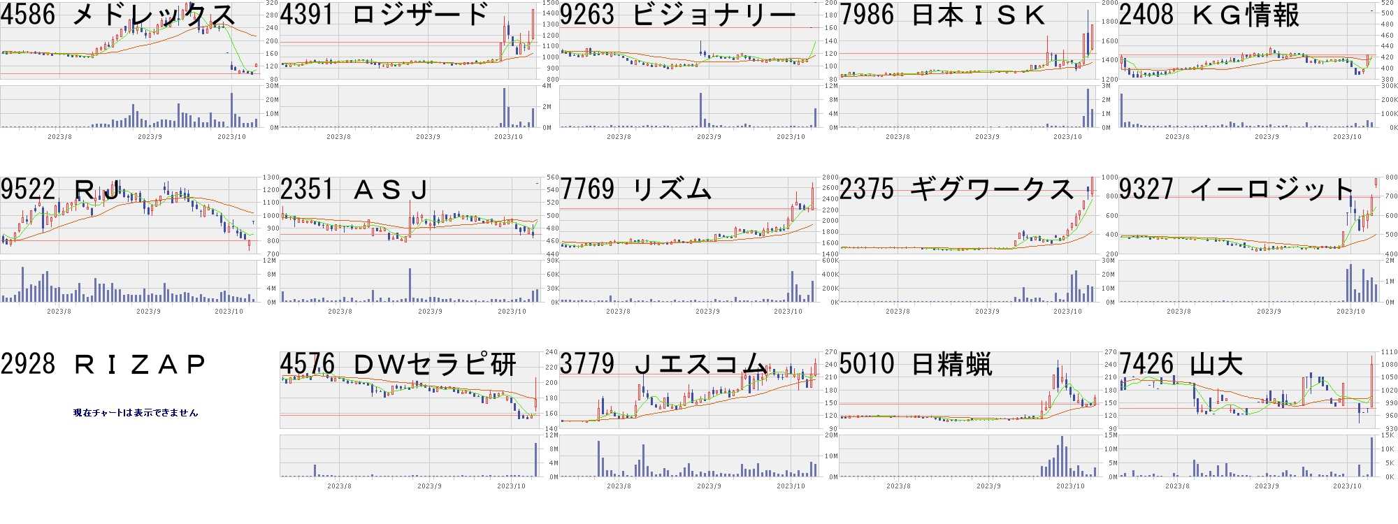 コード,銘柄名,市場,株価,前日比,前日比.1,出来高,PER,PBR,利回り4586,メドレックス,東G,127,30,+30.93%,5996400,-,2.92,-4391,ロジザード,東G,1432,300,+26.50%,1760000,20.2,2.7,1.059263,ビジョナリー,東S,200,40,+25.00%,5363900,303,2.5,-7986,日本ISK,東S,1763,300,+20.51%,1259700,22.0,0.75,1.702408,KG情報,東S,504,80,+18.87%,33200,13.6,0.63,5.959522,RJ,東G,951,150,+18.73%,794300,37.7,2.69,-2351,ASJ,東G,550,80,+17.02%,26900,67.3,1.76,0.367769,リズム,東P,2591,374,+16.87%,293800,26.7,0.72,1.872375,ギグワークス,東S,999,140,+16.30%,10669400,-,7.16,-9327,イーロジット,東S,792,100,+14.45%,825500,-,2.44,-2928,RIZAP,札A,237,28,+13.40%,4146400,-,12.21,-4576,DWセラピ研,東G,178,21,+13.38%,9479200,-,3.16,-3779,Jエスコム,東S,241,24,+11.06%,5939300,-,5.78,-5010,日精蝋,東S,162,16,+10.96%,3053200,-,0.8,-7426,山大,東S,1079,103,+10.55%,14000,299,0.32,2.78コード,銘柄名,市場,株価,前日比,前日比.1,出来高,PER,PBR,利回り6731,ピクセラ,東S,2.0,-1.0,-33.33%,4428800,-,2.04,-4593,ヘリオス,東G,158.0,-70.0,-30.70%,11294000,-,3.63,-3907,シリコンスタ,東G,1195.0,-400.0,-25.08%,218300,23.0,2.0,-7477,ムラキ,東S,2084.0,-500.0,-19.35%,18400,24.7,1.16,0.969982,タキヒヨー,東S,950.0,-218.0,-18.66%,343800,21.9,0.29,2.114173,WACUL,東G,675.0,-150.0,-18.18%,796400,24.2,4.39,-2687,CVSベイ,東S,740.0,-150.0,-16.85%,895200,11.2,1.24,2.709930,北沢産,東S,282.0,-57.0,-16.81%,1766100,13.1,0.55,1.774882,ペルセウス,東G,507.0,-93.0,-15.50%,7751100,-,3.07,-6997,日ケミコン,東P,1287.0,-232.0,-15.27%,1780400,-,0.69,-9348,アイスペース,東G,848.0,-150.0,-15.03%,3286700,-,28.78,-3064,モノタロウ,東P,1300.0,-194.5,-13.01%,11052800,28.3,8.12,1.235704,JMC,東G,1202.0,-179.0,-12.96%,592500,24.7,2.43,-4379,フォトシンス,東G,575.0,-68.0,-10.58%,343600,-,4.4,-7427,エコーTD,東S,1379.0,-140.0,-9.22%,394000,6.8,0.81,2.03にほんブログ村