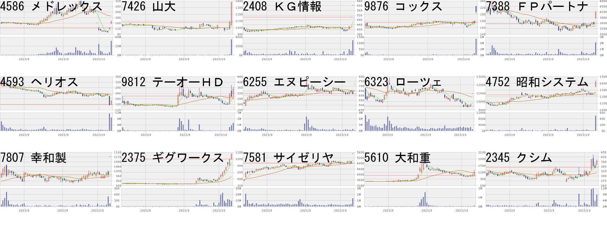 コード,銘柄名,市場,株価,前日比,前日比.1,出来高,PER,PBR,利回り4586,メドレックス,東G,169,42,+33.07%,30967400,-,3.89,-7426,山大,東S,1379,300,+27.80%,342100,383,0.41,2.182408,KG情報,東S,604,100,+19.84%,121200,16.3,0.76,4.979876,コックス,東S,209,34,+19.43%,5336100,16.0,0.8,-7388,FPパートナ,東P,4195,630,+17.67%,2088300,25.5,8.17,2.154593,ヘリオス,東G,185,27,+17.09%,8700900,-,4.25,-9812,テーオーHD,東S,350,51,+17.06%,1264800,14.0,4.57,-6255,エヌピーシー,東G,721,100,+16.10%,207900,14.4,1.92,0.976323,ローツェ,東P,10940,1500,+15.89%,98300,12.3,2.32,1.234752,昭和システム,東S,1415,192,+15.70%,49300,11.5,1.4,2.837807,幸和製,東S,1124,150,+15.40%,14400,5.9,1.97,0.982375,ギグワークス,東S,1149,150,+15.02%,8833600,-,8.24,-7581,サイゼリヤ,東P,5530,700,+14.49%,1341300,33.0,2.75,0.335610,大和重,東S,1194,133,+12.54%,99700,17.5,0.55,-2345,クシム,東S,396,42,+11.86%,7793300,-,1.06,-コード,銘柄名,市場,株価,前日比,前日比.1,出来高,PER,PBR,利回り8256,プロルート,東S,18.0,-7.0,-28.00%,3289000,81.8,-,-3760,ケイブ,東S,1505.0,-300.0,-16.62%,705500,-,2.57,-4334,ユークス,東S,1396.0,-187.0,-11.81%,1298200,9.8,3.02,3.013907,シリコンスタ,東G,1071.0,-124.0,-10.38%,425800,20.7,1.79,-7769,リズム,東P,2322.0,-269.0,-10.38%,81300,24.0,0.65,2.093399,山岡家,東S,3440.0,-370.0,-9.71%,162300,30.1,6.15,0.233349,コスモス薬品,東P,14200.0,-1445.0,-9.24%,851700,23.6,2.61,0.857477,ムラキ,東S,1895.0,-189.0,-9.07%,16700,22.4,1.05,1.064391,ロジザード,東G,1305.0,-127.0,-8.87%,2551900,18.4,2.46,1.152157,コシダカHD,東P,1053.0,-99.0,-8.59%,3099200,14.8,3.38,1.337501,ティムコ,東S,759.0,-71.0,-8.55%,50100,14.7,0.40,1.588166,タカキュー,東S,82.0,-7.0,-7.87%,204700,50.0,-,-5010,日精蝋,東S,150.0,-12.0,-7.41%,1151800,-,0.74,-3093,トレファク,東P,1180.0,-94.0,-7.38%,2435100,13.7,3.72,2.122670,ABCマート,東P,2492.0,-194.0,-7.22%,3385200,17.4,1.90,2.30にほんブログ村