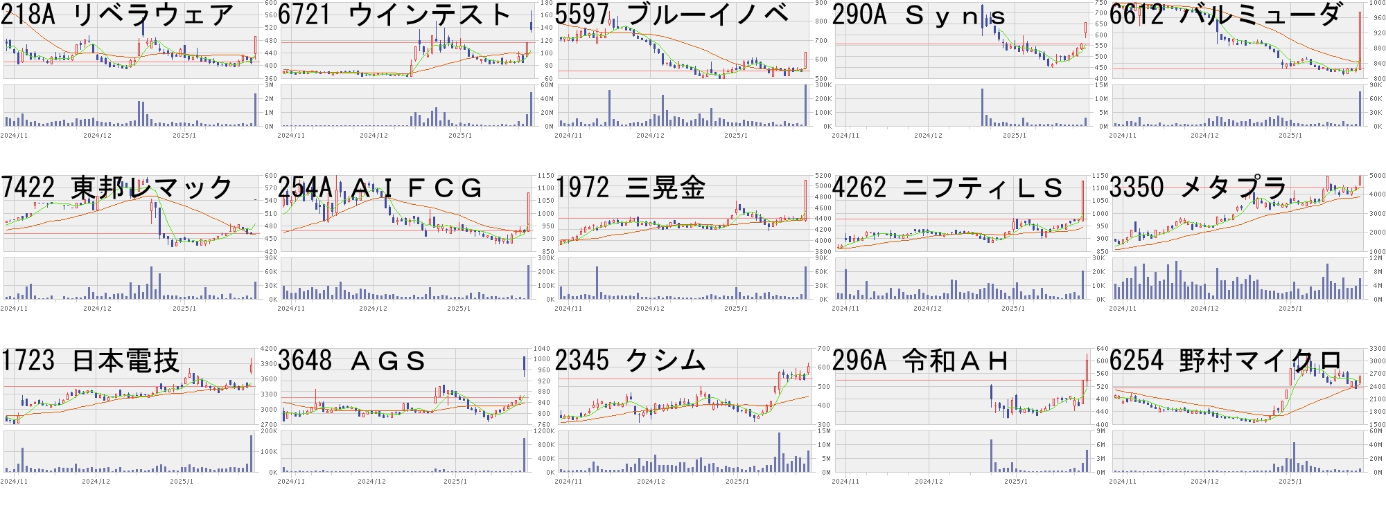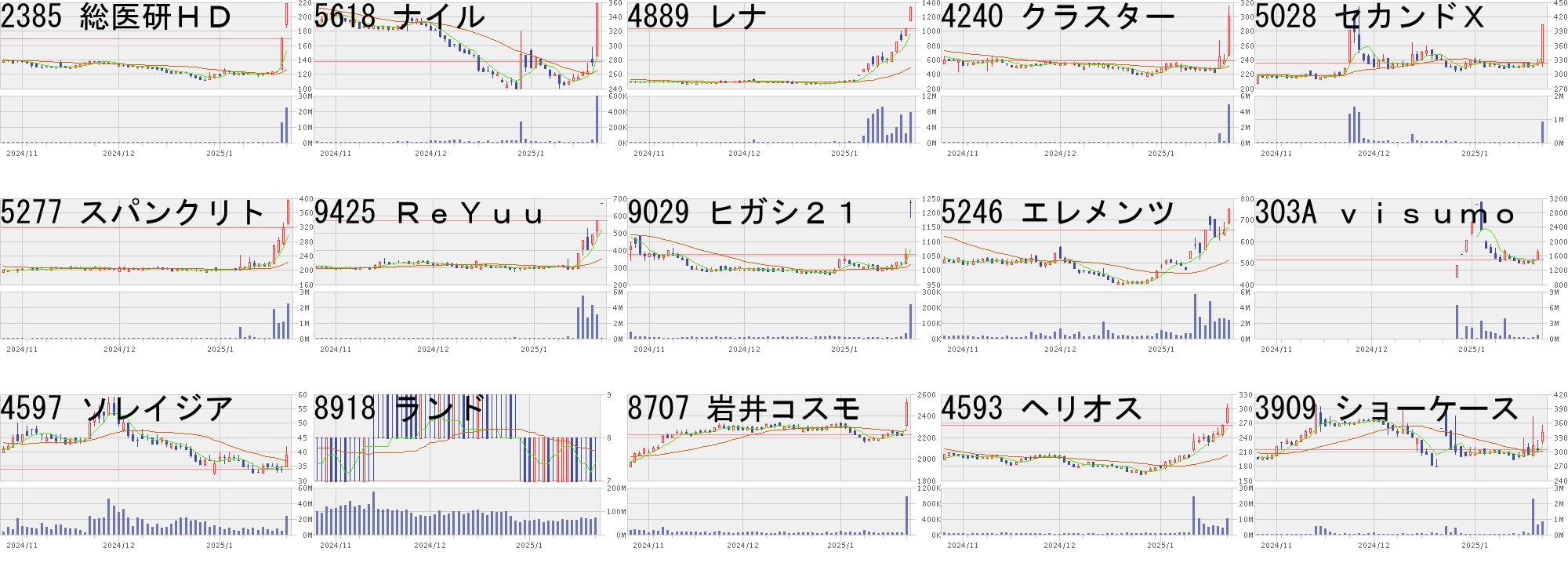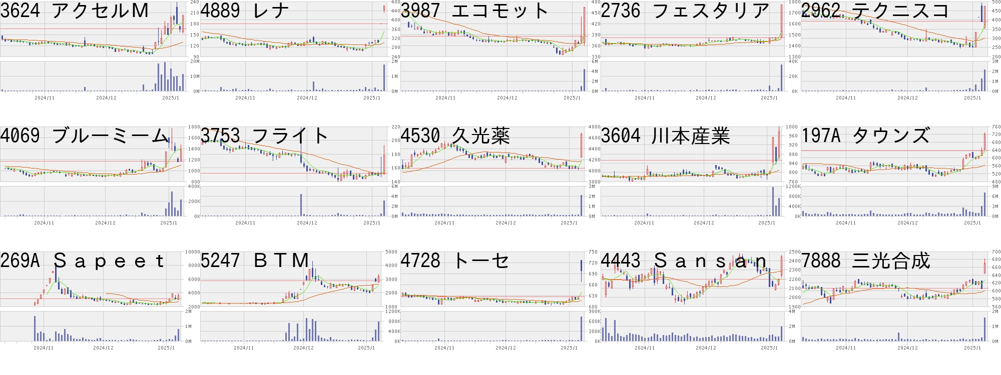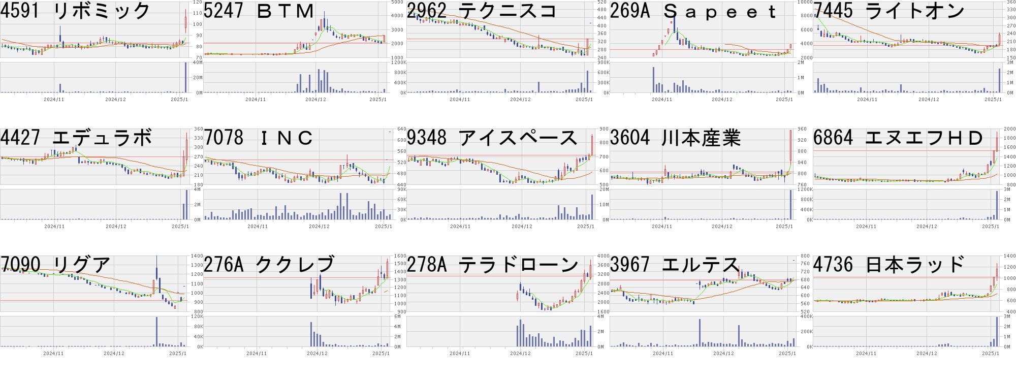 コード,銘柄名,市場,株価,前日比,前日比.1,出来高,PER,PBR,利回り4591,リボミック,東G,106,23,+27.71%,38869200,-,1.33,-5247,BTM,東G,2551,500,+24.38%,126600,74.9,5.64,-2962,テクニスコ,東S,413,80,+24.02%,54400,-,0.9,-269A,Sapeet,東G,3860,700,+22.15%,96900,92.2,36.45,-7445,ライトオン,東S,235,40,+20.51%,2339300,-,21.0,-4427,エデュラボ,東G,324,55,+20.45%,3805500,-,2.43,-7078,INC,東G,628,100,+18.94%,14200,1570,2.29,-9348,アイスペース,東G,844,134,+18.87%,16046400,-,15.5,-3604,川本産業,東S,954,150,+18.66%,1155400,12.2,0.75,2.106864,エヌエフHD,東S,1802,272,+17.78%,2757800,35.1,1.02,1.787090,リグア,東G,1070,150,+16.30%,4800,17.9,2.96,-276A,ククレブ,東G,1523,200,+15.12%,501000,19.0,6.66,-278A,テラドローン,東G,3585,470,+15.09%,2709800,-,7.84,-3967,エルテス,東G,777,100,+14.77%,102100,31.3,1.88,-4736,日本ラッド,東S,1157,147,+14.55%,2857200,19.3,1.97,0.86コード,銘柄名,市場,株価,前日比,前日比.1,出来高,PER,PBR,利回り303A,visumo,東G,2340,-700,-23.03%,3314100,93.4,9.58,-4935,リベルタ,東S,5390,-1000,-15.65%,97200,435,21.27,0.17304A,フォルシア,東G,3010,-450,-13.01%,161100,31.4,2.43,-8918,ランド,東S,7,-1,-12.50%,65183200,11.9,1.29,-5241,日本オーエー,名N,1103,-149,-11.90%,35000,12.5,1.44,1.634069,ブルーミーム,東G,1367,-145,-9.59%,110600,-,1.83,-6721,ウインテスト,東S,96,-10,-9.43%,3251400,-,3.33,-6228,JET,東S,1307,-133,-9.24%,1140300,19.1,1.38,1.30297A,アルピコHD,東S,251,-25,-9.06%,3827500,10.5,1.5,1.203807,フィスコ,東G,133,-13,-8.90%,2522300,-,43.89,-6522,アスタリスク,東G,529,-50,-8.64%,938700,38.0,2.45,-7615,京都友禅HD,東S,85,-8,-8.60%,1964900,-,0.5,-3858,ユビAI,東S,530,-47,-8.15%,3370400,-,2.46,-6496,中北製,東S,3160,-275,-8.01%,27500,6.3,0.45,3.163377,バイク王,東S,475,-41,-7.95%,260300,35.5,1.01,2.32にほんブログ村