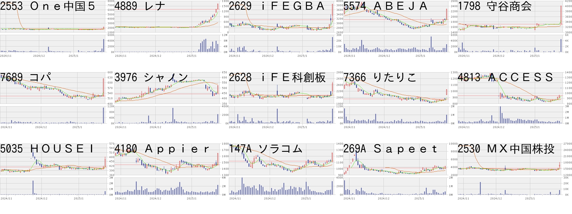 コード,銘柄名,市場,株価,前日比,前日比.1,出来高,PER,PBR,利回り2553,One中国5,東E,2152.0,400.0,+22.83%,446810,-,-,-4889,レナ,東G,1625.0,300.0,+22.64%,5434100,448,13.47,-2629,iFEGBA,東E,3860.0,700.0,+22.15%,25743,-,-,-5574,ABEJA,東G,2287.0,400.0,+21.20%,260100,107,5.37,-1798,守谷商会,東S,4010.0,700.0,+21.15%,4500,6.5,0.59,2.497689,コパ,東G,623.0,100.0,+19.12%,109100,1832,1.41,-3976,シャノン,東G,522.0,80.0,+18.10%,213000,-,-,-2628,iFE科創板,東E,2430.0,360.0,+17.39%,101798,-,-,-7366,りたりこ,東P,1024.0,150.0,+17.16%,990400,20.3,3.13,0.884813,ACCESS,東P,1100.0,150.0,+15.79%,54500,-,1.78,-5035,HOUSEI,東G,465.0,52.0,+12.59%,584600,53.4,1.03,0.654180,Appier,東P,1644.0,183.0,+12.53%,2200600,88.0,5.47,0.12147A,ソラコム,東G,1246.0,125.0,+11.15%,309300,82.0,5.83,-269A,Sapeet,東G,4150.0,400.0,+10.67%,358600,99.2,39.19,-2530,MX中国株投,東E,16670.0,1510.0,+9.96%,7585,-,-,-コード,銘柄名,市場,株価,前日比,前日比.1,出来高,PER,PBR,利回り9425,ReYuu,東S,569,-100,-14.95%,2543900,-,3.58,-8918,ランド,東S,7,-1,-12.50%,56207300,11.9,1.23,-6857,アドテスト,東P,8162,-1023,-11.14%,31500300,49.2,12.62,-291A,リスキル,東G,3615,-435,-10.74%,240200,17.8,7.13,-6875,メガチップス,東P,5680,-670,-10.55%,208500,19.4,0.76,2.115631,日製鋼,東P,5157,-565,-9.87%,2740100,23.7,2.10,1.474461,一工薬,東P,3240,-350,-9.75%,235900,12.4,0.82,2.781773,YTL,東P,65,-7,-9.72%,336000,-,-,-4593,ヘリオス,東G,272,-29,-9.63%,7940900,-,14.33,-5803,フジクラ,東P,5921,-601,-9.21%,32017900,26.3,4.70,1.132385,総医研HD,東G,199,-19,-8.72%,6967600,-,0.88,-6721,ウインテスト,東S,86,-8,-8.51%,2547200,-,3.08,-6855,電子材料,東S,2005,-179,-8.20%,858800,10.6,0.96,2.74224A,GXウラン,東E,991,-87,-8.07%,39688,-,-,-5344,MARUWA,東P,41810,-3520,-7.77%,314800,-,4.37,0.22にほんブログ村