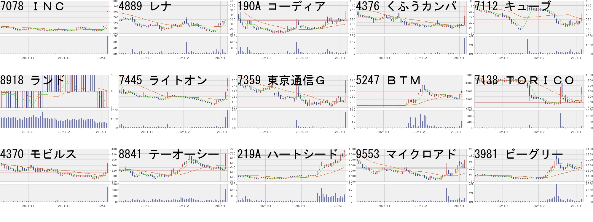 コード,銘柄名,市場,株価,前日比,前日比.1,出来高,PER,PBR,利回り7078,INC,東G,815,187,+29.78%,11967100,2037,2.97,-4889,レナ,東G,382,80,+26.49%,54100,105,3.17,-190A,コーディア,東G,391,80,+25.72%,11382900,-,6.42,-4376,くふうカンパ,東G,245,35,+16.67%,3586000,-,1.37,-7112,キューブ,東G,570,80,+16.33%,48900,23.0,0.87,-8918,ランド,東S,8,1,+14.29%,51611000,13.6,1.4,-7445,ライトオン,東S,267,32,+13.62%,3927100,-,23.86,-7359,東京通信G,東G,293,33,+12.69%,10674000,-,4.33,-5247,BTM,東G,2859,308,+12.07%,441100,83.9,6.32,-7138,TORICO,東G,830,86,+11.56%,64700,-,1.17,-4370,モビルス,東G,348,36,+11.54%,248300,-,1.66,-8841,テーオーシー,東S,699,72,+11.48%,644800,40.7,0.64,1.43219A,ハートシード,東G,3755,375,+11.09%,2451900,-,12.63,-9553,マイクロアド,東G,246,24,+10.81%,799400,227,2.08,-3981,ビーグリー,東S,1891,166,+9.62%,91100,11.3,1.45,0.90コード,銘柄名,市場,株価,前日比,前日比.1,出来高,PER,PBR,利回り4736,日本ラッド,東S,857.0,-300.0,-25.93%,1004800,14.3,1.46,1.176864,エヌエフHD,東S,1402.0,-400.0,-22.20%,62100,27.3,0.79,2.28303A,visumo,東G,1840.0,-500.0,-21.37%,1390600,73.5,7.53,-4935,リベルタ,東S,4390.0,-1000.0,-18.55%,29200,354,17.32,0.21269A,Sapeet,東G,3160.0,-700.0,-18.13%,349700,75.5,29.84,-3656,KLab,東P,139.0,-29.0,-17.26%,4839900,-,0.58,-4591,リボミック,東G,90.0,-16.0,-15.09%,10261900,-,1.13,-7730,マニー,東P,1605.0,-275.0,-14.63%,2302200,24.9,3.02,2.434069,ブルーミーム,東G,1170.0,-197.0,-14.41%,71600,-,1.57,-3687,Fスターズ,東P,1814.0,-305.0,-14.39%,3610400,30.8,8.69,0.993858,ユビAI,東S,456.0,-74.0,-13.96%,1104100,-,2.12,-6597,HPCシス,東G,1205.0,-166.0,-12.11%,376700,12.2,2.25,2.165029,サークレイス,東G,708.0,-96.0,-11.94%,91900,20.1,3.77,-3461,パルマ,東G,528.0,-67.0,-11.26%,60400,17.0,1.53,2.468746,UNBANK,東S,286.0,-35.0,-10.90%,652200,-,0.53,-にほんブログ村
