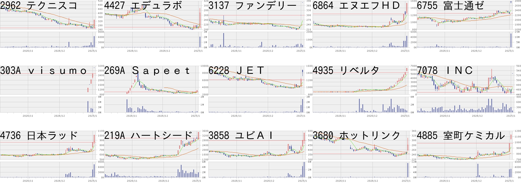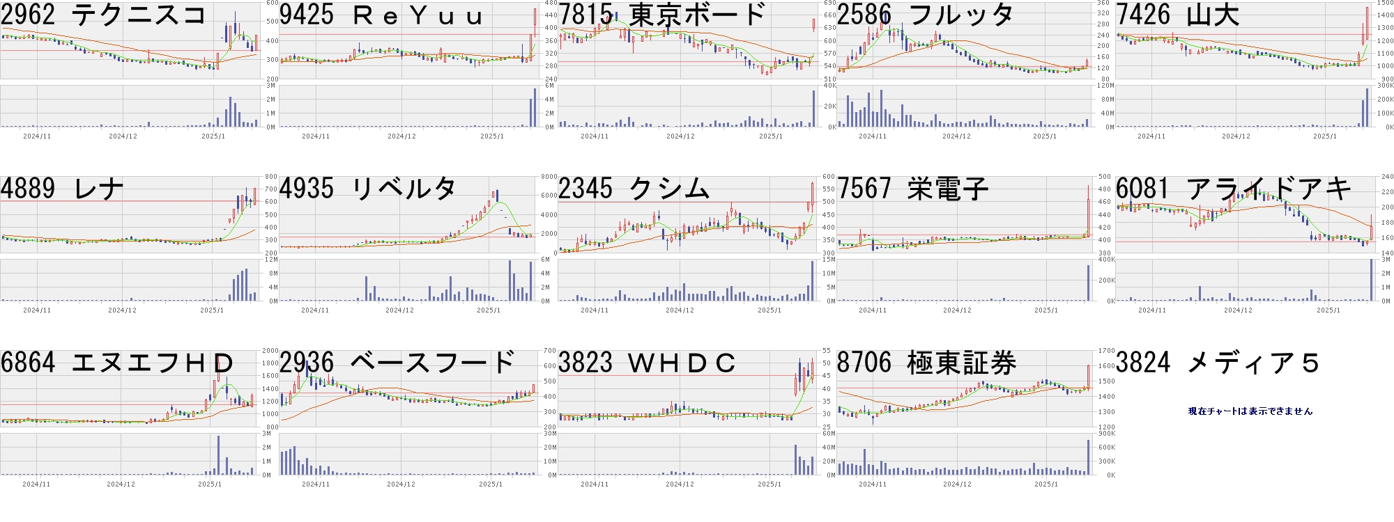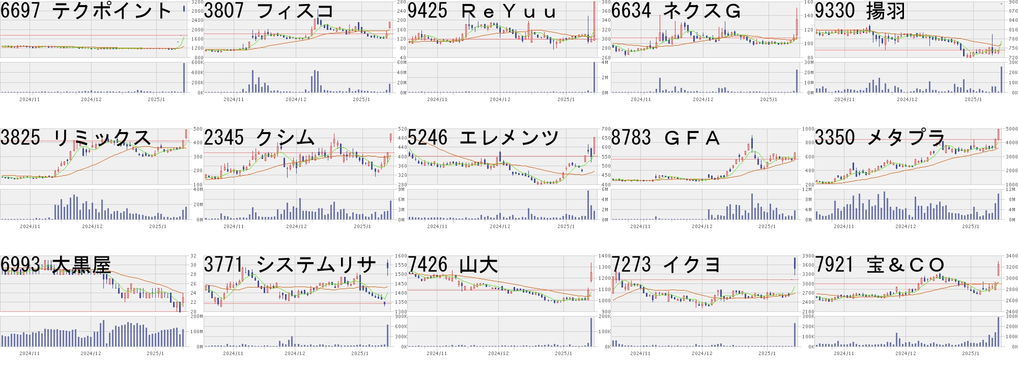 コード,銘柄名,市場,株価,前日比,前日比.1,出来高,PER,PBR,利回り2962,テクニスコ,東S,333,80,+31.62%,638200,-,0.73,-4427,エデュラボ,東G,269,60,+28.71%,2033000,-,2.02,-3137,ファンデリー,東G,380,80,+26.67%,29000,126,9.56,-6864,エヌエフHD,東S,1530,300,+24.39%,430900,29.8,0.86,2.096755,富士通ゼ,東P,2750,477,+20.99%,13088500,-,2.27,0.69303A,visumo,東G,3040,504,+19.87%,34600,121,12.44,-269A,Sapeet,東G,3160,504,+18.98%,124100,75.5,29.84,-6228,JET,東S,1440,229,+18.91%,2542600,21.0,1.52,1.184935,リベルタ,東S,6390,1000,+18.55%,461100,516,25.21,0.147078,INC,東G,528,80,+17.86%,9600,1320,1.92,-4736,日本ラッド,東S,1010,150,+17.44%,746200,16.8,1.72,0.99219A,ハートシード,東G,3475,501,+16.85%,1801500,-,11.68,-3858,ユビAI,東S,577,80,+16.10%,3914700,-,2.68,-3680,ホットリンク,東G,281,38,+15.64%,10977800,95.9,0.72,-4885,室町ケミカル,東S,1131,150,+15.29%,325200,15.1,2.0,2.21コード,銘柄名,市場,株価,前日比,前日比.1,出来高,PER,PBR,利回り2850,野村ESGコ,東E,2090.0,-738.0,-26.10%,39580,-,-,-7118,伸和HD,札A,2936.0,-699.0,-19.23%,22600,28.1,7.29,1.097067,ブランドT,東G,1012.0,-226.0,-18.26%,195800,21.2,1.34,0.997074,24セブン,東G,351.0,-53.0,-13.12%,1678800,-,-,-4784,GMOインタ,東P,901.0,-96.0,-9.63%,712000,4505,48.29,0.776620,宮越HD,東P,1480.0,-146.0,-8.98%,345800,164,2.25,-4416,トゥルーD,東G,717.0,-70.0,-8.89%,298300,39.4,3.25,-7090,リグア,東G,920.0,-85.0,-8.46%,14100,15.4,2.55,-2742,ハローズ,東P,4135.0,-360.0,-8.01%,424500,11.9,1.32,1.26130A,ウェリタス,東G,861.0,-74.0,-7.91%,126900,-,2.43,-9073,京極運,東S,1310.0,-112.0,-7.88%,116800,44.8,0.89,0.764107,伊勢化,東S,30250.0,-2550.0,-7.77%,358200,30.2,4.52,1.195241,日本オーエー,名N,1252.0,-105.0,-7.74%,30900,14.2,1.63,1.444237,フジプレアム,東S,387.0,-31.0,-7.42%,665700,28.9,1.13,1.55299A,dely,東G,1052.0,-84.0,-7.39%,359800,26.9,4.49,-にほんブログ村