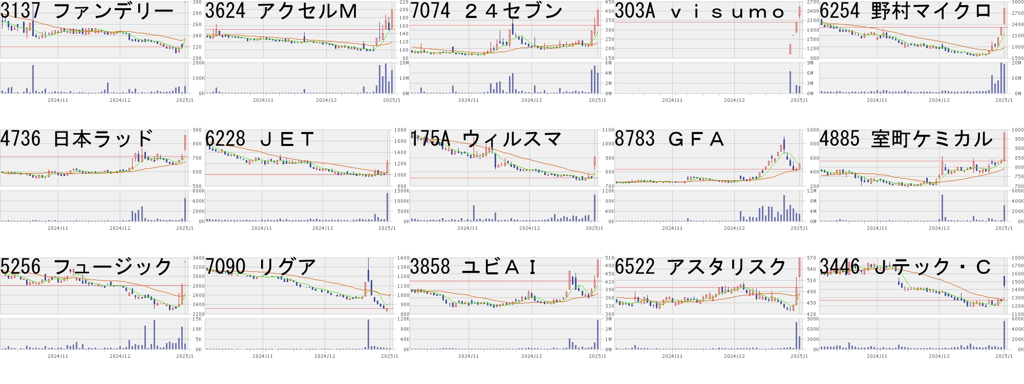コード,銘柄名,市場,株価,前日比,前日比.1,出来高,PER,PBR,利回り3137,ファンデリー,東G,300,80,+36.36%,45100,100,7.55,-3624,アクセルM,東G,196,45,+29.80%,14872600,-,4.64,-7074,24セブン,東G,404,80,+24.69%,3998400,-,-,-303A,visumo,東G,2536,500,+24.56%,2029200,101,10.38,-6254,野村マイクロ,東P,2811,500,+21.64%,18897200,12.3,3.90,2.494736,日本ラッド,東S,860,150,+21.13%,448000,14.3,1.47,1.166228,JET,東S,1211,202,+20.02%,1363500,17.7,1.28,1.40175A,ウィルスマ,東G,905,150,+19.87%,103000,-,3.36,-8783,GFA,東S,520,80,+18.18%,2675400,117,10.72,-4885,室町ケミカル,東S,981,150,+18.05%,300200,13.1,1.74,2.555256,フュージック,東G,3305,500,+17.83%,2600,23.4,4.26,-7090,リグア,東G,1005,150,+17.54%,3100,16.8,2.78,-3858,ユビAI,東S,497,74,+17.49%,2828500,-,2.31,-6522,アスタリスク,東G,570,80,+16.33%,369300,40.9,2.63,-3446,Jテック・C,東P,1460,194,+15.32%,547400,37.2,3.32,-コード,銘柄名,市場,株価,前日比,前日比.1,出来高,PER,PBR,利回り7067,ブランドT,東G,1238,-400,-24.42%,4400,25.9,1.64,0.814784,GMOインタ,東P,997,-202,-16.85%,709300,4985,53.43,0.69304A,フォルシア,東G,3400,-640,-15.84%,302100,35.5,2.75,-6620,宮越HD,東P,1626,-306,-15.84%,405800,180,2.47,-3416,ピクスタ,東G,1115,-147,-11.65%,155100,5.8,1.73,4.043775,ガイアックス,名N,721,-94,-11.53%,139300,11.5,2.55,7.634576,DWセラピ研,東G,178,-23,-11.44%,5633900,-,7.17,-5029,サークレイス,東G,671,-86,-11.36%,91100,19.1,3.58,-9073,京極運,東S,1422,-177,-11.07%,331900,48.7,0.97,0.705588,ファーストA,東G,1732,-208,-10.72%,160300,43.0,17.72,0.066063,EAJ,東S,800,-94,-10.51%,28500,33.6,1.18,1.007128,フルマルHD,東P,2333,-261,-10.06%,249500,12.3,0.77,4.597746,岡本硝子,東S,225,-25,-10.00%,2040500,43.6,3.25,-298A,GVAテック,東G,555,-60,-9.76%,393700,-,13.22,-2160,ジーエヌアイ,東G,3090,-315,-9.25%,1777700,22.0,4.68,-にほんブログ村