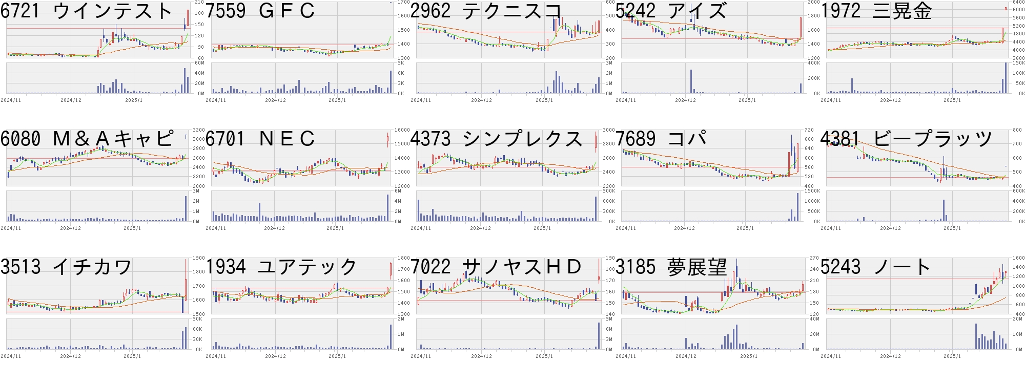 コード,銘柄名,市場,株価,前日比,前日比.1,出来高,PER,PBR,利回り6721,ウインテスト,東S,188,50,+36.23%,31811200,-,6.73,-7559,GFC,東S,1694,300,+21.52%,6500,26.6,0.54,-2962,テクニスコ,東S,464,80,+20.83%,1516100,-,1.01,-5242,アイズ,東G,1771,300,+20.39%,123700,128,2.76,-1972,三晃金,東S,6100,1000,+19.61%,147700,8.7,0.9,5.746080,M&Aキャピ,東P,3085,502,+19.43%,2402800,17.9,2.44,1.686701,NEC,東P,15525,2410,+18.38%,5116700,22.7,2.08,0.904373,シンプレクス,東P,2911,443,+17.95%,707300,23.4,3.41,1.727689,コパ,東G,660,100,+17.86%,1364600,1941,1.5,-4381,ビープラッツ,東G,539,80,+17.43%,6400,-,3.71,-3513,イチカワ,東S,1744,230,+15.19%,64300,9.3,0.34,4.591934,ユアテック,東P,1747,219,+14.33%,1587000,10.9,0.85,3.617022,サノヤスHD,東S,173,21,+13.82%,7759600,14.4,0.63,2.893185,夢展望,東G,199,23,+13.07%,7469200,-,62.97,-5243,ノート,東G,1300,149,+12.95%,3632800,193,12.51,-コード,銘柄名,市場,株価,前日比,前日比.1,出来高,PER,PBR,利回り2553,One中国5,東E,1713.5,-635.5,-27.05%,499160,-,-,-4889,レナ,東G,1125.0,-400.0,-26.23%,5619200,310,9.33,-2629,iFEGBA,東E,2838.0,-882.0,-23.71%,46078,-,-,-9552,M&A総研,東P,1563.0,-400.0,-20.38%,247800,13.5,9.04,-2127,日本M&A,東P,609.1,-110.4,-15.34%,19566200,17.6,4.50,4.766196,ストライク,東P,3175.0,-530.0,-14.30%,955100,10.8,3.56,3.214816,東映アニメ,東S,3180.0,-510.0,-13.82%,2622100,33.3,4.50,0.975449,大阪製鉄,東S,2350.0,-373.0,-13.70%,801500,25.4,0.60,1.458918,ランド,東S,7.0,-1.0,-12.50%,62122500,11.9,1.23,-4255,THECOO,東G,716.0,-101.0,-12.36%,31800,-,5.46,-7205,日野自,東P,510.0,-71.1,-12.24%,14127500,-,2.31,-4417,Gセキュリ,東G,4730.0,-610.0,-11.42%,274800,34.2,12.95,0.88219A,ハートシード,東G,1808.0,-220.0,-10.85%,2924300,-,6.08,-5574,ABEJA,東G,2600.0,-306.0,-10.53%,1446600,122,6.11,-4564,オンコセラピ,東G,26.0,-3.0,-10.34%,5480100,-,7.62,-にほんブログ村