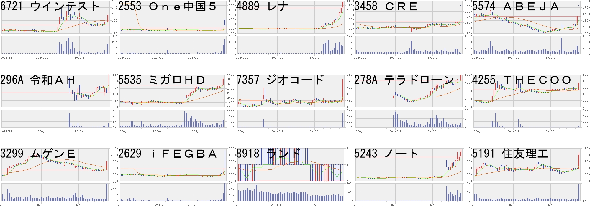 コード,銘柄名,市場,株価,前日比,前日比.1,出来高,PER,PBR,利回り6721,ウインテスト,東S,116.0,30.0,+34.88%,16262600,-,4.15,-2553,One中国5,東E,2849.0,697.0,+32.39%,719740,-,-,-4889,レナ,東G,2025.0,400.0,+24.62%,5385900,559,16.79,-3458,CRE,東P,1614.0,300.0,+22.83%,18800,9.5,1.18,-5574,ABEJA,東G,2787.0,500.0,+21.86%,68600,130,6.54,-296A,令和AH,東G,539.0,80.0,+17.43%,1808500,27.1,7.61,2.885535,ミガロHD,東P,3605.0,520.0,+16.86%,496900,40.6,4.79,0.787357,ジオコード,東S,727.0,100.0,+15.95%,462300,67.1,1.71,3.44278A,テラドローン,東G,4940.0,660.0,+15.42%,970400,-,10.80,-4255,THECOO,東G,773.0,100.0,+14.86%,40100,-,5.89,-3299,ムゲンE,東S,1988.0,254.0,+14.65%,880300,7.6,1.51,5.232629,iFEGBA,東E,4420.0,560.0,+14.51%,59691,-,-,-8918,ランド,東S,8.0,1.0,+14.29%,59713100,13.6,1.40,-5243,ノート,東G,1290.0,158.0,+13.96%,8981500,180,11.67,-5191,住友理工,東P,1798.0,218.0,+13.80%,1857500,7.5,0.86,3.34コード,銘柄名,市場,株価,前日比,前日比.1,出来高,PER,PBR,利回り9425,ReYuu,東S,469,-100,-17.57%,1410700,-,2.95,-4461,一工薬,東P,2891,-349,-10.77%,554500,11.1,0.73,3.113807,フィスコ,東G,192,-22,-10.28%,4437000,-,63.37,-6521,オキサイド,東G,1364,-148,-9.79%,301800,-,3.07,-7794,EDP,東G,615,-63,-9.29%,586100,-,1.91,-5028,セカンドX,東G,370,-33,-8.19%,803300,24.4,4.07,-3070,ジェリビンズ,東G,131,-10,-7.09%,361000,-,19.26,-219A,ハートシード,東G,2038,-152,-6.94%,2117900,-,6.85,-5618,ナイル,東G,335,-25,-6.94%,447800,-,4.24,-5277,スパンクリト,東S,400,-29,-6.76%,811000,-,0.56,-5461,中部鋼鈑,東P,2297,-160,-6.51%,220000,51.8,0.81,4.402530,MX中国株投,東E,15665,-1005,-6.03%,18540,-,-,-5035,HOUSEI,東G,438,-27,-5.81%,148700,50.3,0.97,0.686254,野村マイクロ,東P,2358,-143,-5.72%,1925500,10.3,3.27,2.971689,WT天然ガス,東E,1215,-73,-5.67%,42614,-,-,-にほんブログ村