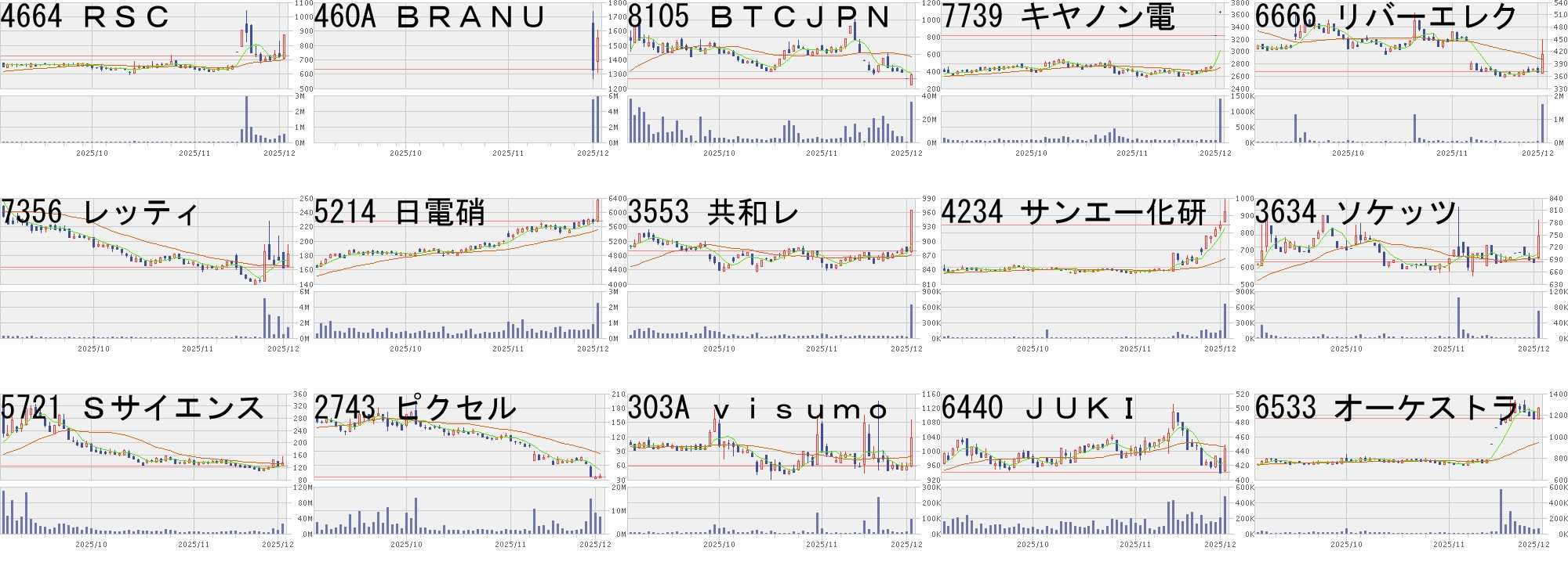 コード,銘柄名,市場,株価,前日比,前日比.1,出来高,PER,PBR,利回り4664,RSC,東S,875,150,+20.69%,536200,12.3,1.15,2.74460A,BRANU,東G,1550,218,+16.37%,5871700,29.4,22.79,-8105,BTCJPN,東S,355,41,+13.06%,34176300,-,8.24,-7739,キヤノン電,東P,3640,380,+11.66%,1389800,19.1,1.21,0.966666,リバーエレク,東S,413,41,+11.02%,1601300,-,0.78,2.427356,レッティ,東G,182,18,+10.98%,1356000,85.0,8.10,-5214,日電硝,東P,6335,569,+9.87%,2213500,20.7,1.03,2.293553,共和レ,東S,965,86,+9.78%,639800,76.6,0.64,5.394234,サンエー化研,東S,921,79,+9.38%,649100,13.1,0.42,1.953634,ソケッツ,東S,747,62,+9.05%,69800,76.1,3.42,0.545721,Sサイエンス,東S,136,11,+8.80%,25740400,-,5.35,-2743,ピクセル,東S,38,3,+8.57%,7158600,-,-,-303A,visumo,東G,1036,78,+8.14%,94700,28.7,3.04,-6440,JUKI,東P,443,33,+8.05%,475500,13.2,0.44,2.266533,オーケストラ,東P,1263,93,+7.95%,61500,14.9,1.84,0.95コード,銘柄名,市場,株価,前日比,前日比.1,出来高,PER,PBR,利回り6993,大黒屋,東S,138.0,-50.0,-26.60%,28310600,-,26.85,-4446,リンクユーG,東P,1150.0,-400.0,-25.81%,3435600,52.9,6.30,-3719,AIストーム,東S,296.0,-80.0,-21.28%,6152600,45.0,3.99,1.011652,iFWIN,東E,3974.0,-921.0,-18.82%,70,-,-,-4570,免疫生物研,東G,3120.0,-700.0,-18.32%,133200,109,17.56,0.192342,トランスGG,東G,407.0,-80.0,-16.43%,592300,169,1.41,-2385,総医研HD,東G,264.0,-48.0,-15.38%,2403200,229,1.15,3.799973,KOZOHD,東S,33.0,-6.0,-15.38%,41914600,-,12.13,-3803,イメージ情報,東G,564.0,-100.0,-15.06%,222600,-,8.01,-4592,サンバイオ,東G,1756.0,-271.0,-13.37%,4343200,-,127,-206A,PRISMバ,東G,196.0,-30.0,-13.27%,14129600,-,2.68,-7318,セレンHD,東G,1080.0,-159.0,-12.83%,488600,5.1,1.79,-7746,岡本硝子,東S,320.0,-45.0,-12.33%,3143400,463,3.65,-3823,WHDC,東S,56.0,-7.0,-11.11%,3982600,-,4.79,-464A,QPSHD,東G,1551.0,-189.0,-10.86%,1039900,149,5.11,-にほんブログ村