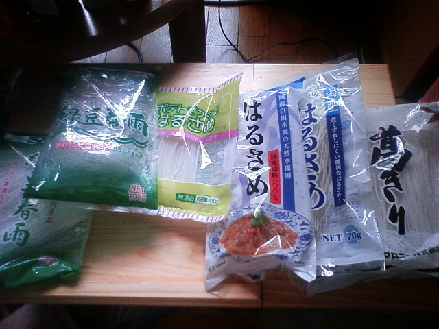 近所で春雨を買い集めてみた。選ぶのはできるだけ国産品だ。左から順に東豊通商(株)中国龍口産緑豆澱粉100%100g東豊通商(株)中国龍口産緑豆澱粉100%105g(35g×3)信濃産業(株)北海道産じゃが芋澱粉、米油使用の100g西日本食品工業(株)国産甘藷、馬鈴薯澱粉混合100g西日本食品工業(株)国産甘藷、馬鈴薯澱粉混合70gマロニー(株)じゃが芋澱粉、葛粉混合500g中国のでは緑豆春雨中国山東省龍口のがメジャーだ。マロニー(株)のは葛粉が入ってるので葛きりになってるが葛粉入ってない物はマロニーでマロニーはマロニー(株)の春雨での登録商標っぽい。春雨スープを70g入りのを半分使って作ってみた。スープはヒオウギ貝の戻し汁と無添加ガラスープの素に醤油とえごま油を入れた。具はヒオウギ貝、エモギ茸、ネギ、伊東家の裏技の味付け卵が入ってる。量が多いから中華スープというより春雨のラーメン風だ。おっと、胡椒を入れ忘れてたぜ( ゚д゚)ウマー買った場所はメモっといて今度買うときの参考にするぜ。