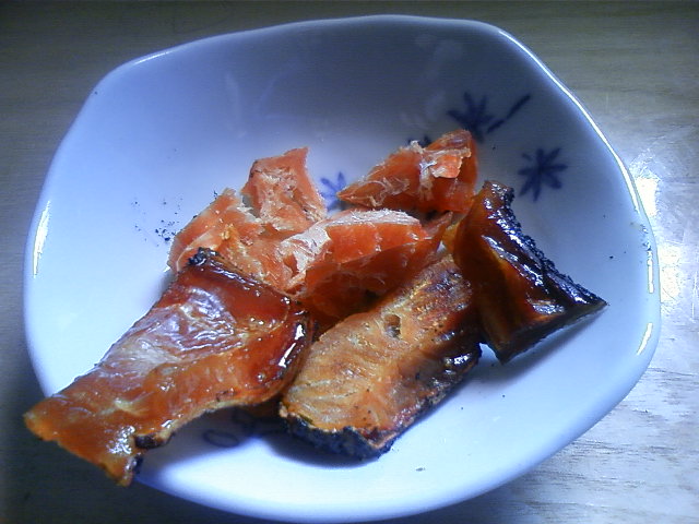 冷凍していた鮭とばがまだ少し残ってる。皮は生臭いのでいつも捨ててたが今回は身が少し付いた状態で炙ってみた。うまみの脂分が熱で活性化するようで( ゚д゚)ウマー気付かなかったが炙った方が美味いよな。身の部分はいつも通り普通に包丁で刻んで食べた。