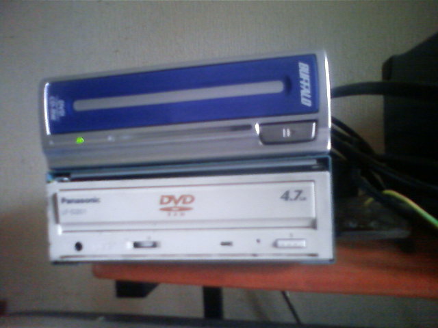 この前までDVD-RAMとDVD-RW4倍速の2台を使ってた。 DVD-RAMはかなり古い松下のLF-D201という内蔵の初期型だ。 NECのPCはノート用のCD-RWが付いてるのでこれは5インチのは内蔵することができない。 更に古いSCSI接続の外付けタイプLF-D100という5.2GBのDVD-RAMの筐体を使い中身だけ入れ替えてみた。 NECのPCにはSCSIボードは増設していないのでRATOCのSCSIをIEEE1394に変換もので接続した。 この前に日記に書いたように入れたドライバのせいで不具合がでてしまったので買い替えになった。 DVD-RW4倍速(メルコDVM-4242iu2)は外付けで中身を今回買った日立LG製のDVDスーパーマルチドライブに入れ替える。 ドライブの長さが違うが中の金具を付け替えて筐体にはめ込んで固定させるだけなので特に問題はない。 USB2.0とIEEE1394どちらでも接続可能だがNECのPCは古いのでUSB2.0には対応していなくてこの前増設したIEEE1394の方で接続する。 今まで使ってるソフトはB'sRecorder GOLD7でこのドライブは対応してなくてDVD-RのDL(2層書き込み)ができないようだ。 2層書き込みは今のところしないので特に問題はない。 写真の上のが今回買った玄人志向日立LGのドライブを入れている。 ビックカメラで4980円のポイント10倍だった。