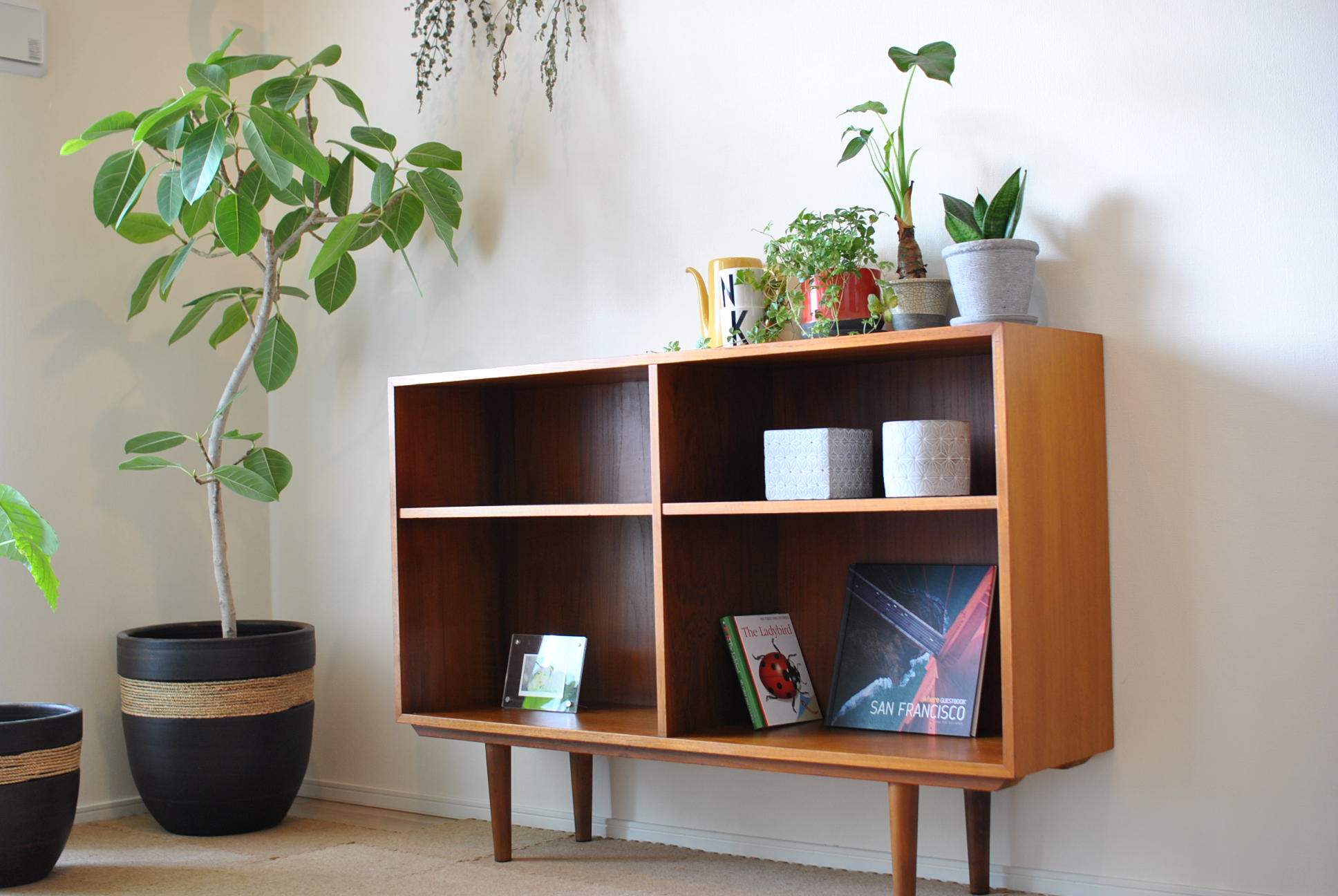 先日ブログでご紹介したデンマーク製ヴィンテージ本棚を、リビングに設置しました。 (正確にはリビング隣の洋室ですが、引戸を全て外し今は広いリビングとして使用しています。) このチークの色見と、ヴィンテージの風合い。一気にここだけ北欧テイストに♪想像以上にグリーンとの相性も◎! 今まで霞んでいた我が家のシンボルツリーのフィカス・アルテシマが引き立つこと! 設置した場所は、以前IKEAのオモチャ収納BOXを4~5箱重ねて置いていたところ。 オモチャは将来の子供部屋(現、モノ置き部屋)とリビング廊下の収納にとりあえずお引っ越し。 今は、遊びたい時に、遊びたいオモチャをリビングに持ち運ぶという少し面倒なシステムに変更しましたが、まずはこのまま様子見で。。 さて、こちらの本棚ですが、見ての通り本などを収納して実用的に使うか、見せる収納として使うかのどちらかで、目隠しできません。 もっと色んなモノを収納するなら、かごを使うなど、工夫が必要ですが、そもそも一番の目的はグリーンを置きたい!グリーンが飾れる台が欲しいということで、背が低めのヴィンテージ家具を探していました。 収納に期待してたわけではないので、しばらくは贅沢な飾り棚として使用します!! ************************* 一時、こういうチーク材のヴィンテージプランターも探してたんですが、なかなか理想のものに出逢えず。。今はあまり出回ってないみたいですね。残念! ************************* ちなみに以前この部屋の角に置いてあった本棚(昭和の古家具)は、ソファーの横に移動させました。 こちらは、雑誌や絵本を収納して、実用的に使用しています。 ということで、全体的に模様替えをしたので、気分もかなり新鮮です☆ ソファーに座りながら正面の新入り本棚を眺めてはニンマリしております 笑 にほんブログ村
