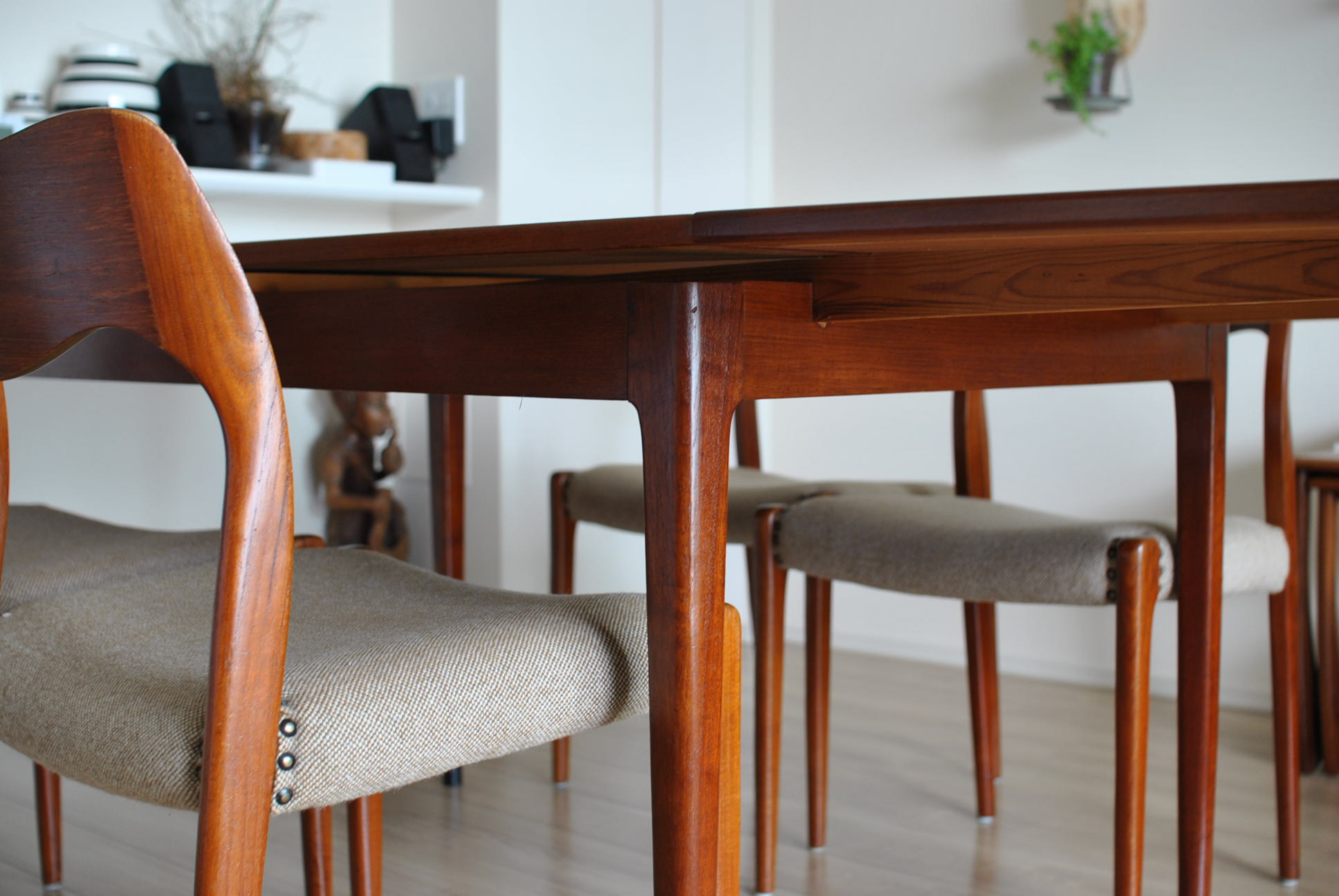 我が家のダイニングテーブルはデンマーク製のエクステンションテーブル(伸張式)で、イスとセットでhaluta さんで購入しました。 JLモラー社のものだと聞いてます。 このテーブル、上の天板を軽く持ち上げて下の板をスライドさせながら引き出すと、段差もなくフラットに大きくできるため、来客時に便利です! 先週末、久しぶりに伸張して使用しました。そしたら、普段は天板下に格納されている 羽根部分にカビっぽいものが!! 拭いてすぐに取れましたが、たまには使用しないとダメですね (; ;) そして久々にオイルも塗り、艶も復活。このチークのヴィンテージの色合いが大好きです。いつになったら、テーブルクロス外して使用できるかな~ にほんブログ村