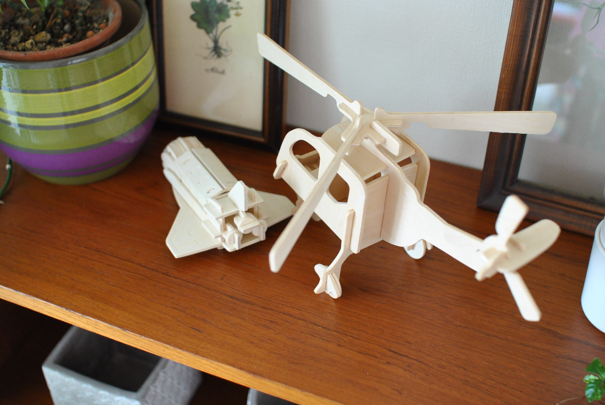 セリアで買った組立式おもちゃ。 木製のヘリコプターとロケットです。 組み立て前はコチラ↓↓↓ 組み立ては、3歳の息子には難しく、ほぼ父親が担当。 説明書がなかったので、難易度は高そうでした。 組み立てる前に、パーツを好きな色で塗ったりするのもいいかも!? それなら息子でもできそう~。 100円なのに、なかなかのクォリティーです。 ちょっとした夏休みの工作にいかがでしょうか~。 にほんブログ村