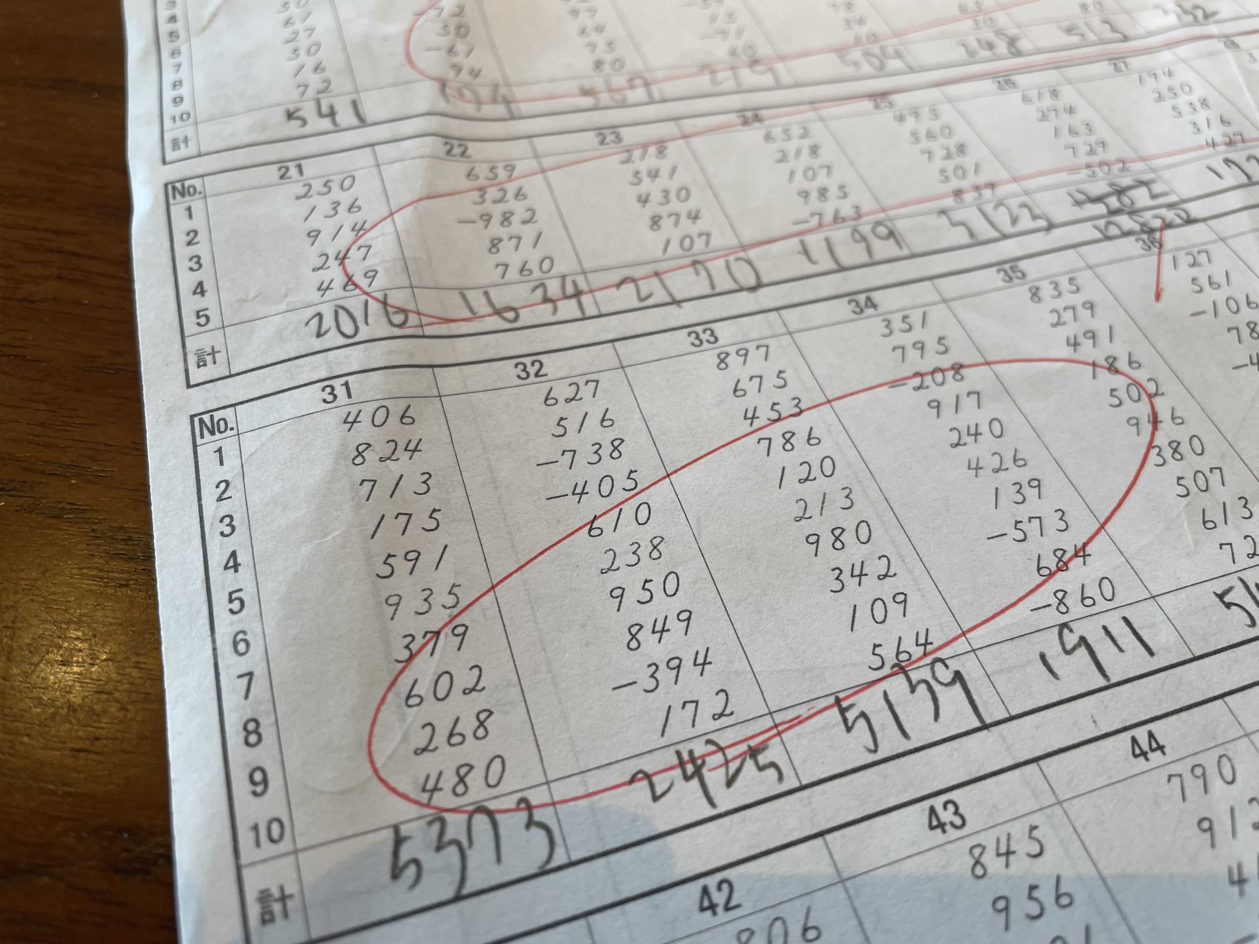 年長からそろばんをスタートし、現在小3の娘。そろばん教室は週2回。自宅での日々の練習はあまりせず、検定試験の前に猛特訓するスタイルで、マイペースに上達してきました。◼️現在の実績◼️日本珠算連盟暗算検定 準1級(2025.7合格)珠算検定 2級(2025.6合格)珠算より暗算が得意な娘ですが、例えば↓写真のNo.32の問題(3桁10口)暗算で解く時間、12秒です。(これらの問題は全部暗算で解きます)ちなみに、中2息子同じ問題を5.5秒で解きます。(暗算4段)そろばんで培ってきた脳内計算機は、電卓の比ではなく。もはや、神業としか思えません。月謝はたしか、7000円前後。一生ものの、脳内計算機が獲得できるなら、コスパ最強だと思います!しかし、使わなければ、そんな能力も薄れていきそうなので、ある程度定着するまで、継続することを目標にしています。色々買い足したい子供服〜😍秋の運動会に目立つスニーカー!娘愛用中のお財布はコレ。