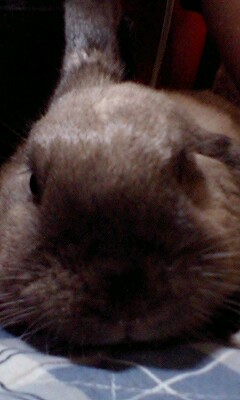 今日も一日中不安定な空模様。いつドンガラガッシャン!と雷と共に大雨になってもおかしく無いような灰色の空が続きました(u.u)~3そんな中、予定通り行って参りましたよ”テディベア・コンベンション”その模様は明日ご報告させて頂くとして、本日は我が家のウサ王子”りん”にまつわる発見のお話でございます^^v我が家のりん 年に2度換毛しますが、回を重ねるごとに全体的に黒味を増しつつ有ります^^;顔なんてチョットおまぬけな泥棒顔ですよ~~~~><体の方はいつもムラ無くキレイに変身を遂げるのですが、今年はどうやら手抜きが有ったようでお尻の方が変な色合いになってしまいました(=.=)""""""""""""次の換毛までこのままなのね・・・とちょっぴり残念に思っていたところだったのですがふと気付いた事があるのです!!「???これは~~~~!? いや~~イイんでない?このまんまでいいわ♪」的発見!! この白い模様、何かに見えませんかぁ??ほらほらぁ~~!耳みたいのがあって~・・・・・・・・・(@w@)ウサさんが横向きで座っているところに似てません????んん??でね、スゴイ事に反対側にも同じ模様があったんですよぉ!!!じゃ、じゃん! え!?見えないですか?????・・・・・・・・・・・・・う~~ん、でもぉ私にはとっても感激大発見!! v(≧ワ≦)v ウオォォオオオオ~~~!! なんすよ(喜)