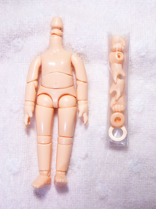 我が家ではオビツ11ボディに青エク一番くじのちびきゅん雪燐のヘッドを付けているんですが、そのやり方を教えてほしいと何件かリクエストを頂いたので、調子に乗ってレポをUPしてみました!★カスタムカテゴリなのでパーツをばらした画像があります。苦手な方はご注意ください!★この解説は「ちびきゅんキャラのヘッドにオビツ11ボディ」を合わせるやり方です。ちびきゅんキャラよりも少し大きい「きゅんキャラ+オビツ11ボディ」の場合はここまで複雑に作業しなくても付けられます。グーグル検索でたくさん方法がHITすると思うので探してみてください(*^ω^*) あくまでド素人によるド素人作業です。もっと上手なやり方たくさんあると思います。こういうやり方もあるのか……程度で、軽い感じで見てください(*^ω^*)オビツ11ボディはこんな感じです。オビツボディ 【オビツ製作所】オビツドール 11cm オビツボディ ホワイティ価格:1,539円(税込、送料別)手の形がデフォルトの他に握り手(にゃんこポーズできますよ!)と少し指を曲げた手と、合計3種類あります。ヘッドをつけるジョイント部分も替えパーツがいくつか入っていますが、ちびきゅんはこのセットのどのジョイントパーツも合わないので、少し改造します。このボディはほとんどが差し込みパーツなので、引っ張れば簡単に取り外せます。腕はこんな感じ。ちなみに肘も手首も同様に外せます。次にボディの胸~首部分を解体します。私は細いマイナスドライバーを腕の穴から差し込んで、ぐらぐら揺らしながら緩める感じで外しています。他にもっと良いやり方があったら教えてください(`;ω;´)このやり方をする場合の注意は、「腕を差し込む穴部分を広げないように気をつける」です。腕が抜け落ちやすくなっちゃうので注意★取り外すと中はこんな感じ。胸側と背中側を二箇所の差込でくっつけている感じですね。ここまで外すと、首のジョイントパーツがポロリと外せるので、外します。今回の作業ではこのジョイントパーツは二度と使いませんが、後々必要になると困るので、無くないように小さなジップ式の袋とかに入れて、購入時の箱に入れて保存しておきましょう。ジョイントパーツを外したところで、ちびきゅんのヘッド部分を当ててバランスを見てみます。このままでも別に悪くないと思います。服を着せたりすると、首の長さはぜんぜん気にならなくなる程度です。このバランスで良い方は その2 まで進んでください。私はもうちょっと首を細く・短くしたいなぁと思ったので、次の作業を追加しました。ヤスリで削って首を細く・短く調整します。ヤスリは一般的な紙の薄いので十分ですが、こういう作業に慣れてない方なら紙タイプよりスポンジタイプが扱いやすいと思います。私が使っているのはスポンジヤスリというやつです。スポンジヤスリアソートセット価格:324円(税込、送料別)上のスポンジヤスリの目の粗いもので大まかにヤスリがけをして、段々目を細かくしてきめを整えていきます。★削る作業をする時の注意★粉がかなり出ます。作業をする場合は粉が飛ばないように水をつけながらやるか、エプロンなどで服をガードしてやってください。水をつけない場合は粉が飛ぶので、マスク(出来るだけ防塵用マスクがいいですが、無ければ花粉用マスクでもいいです)を必ず付けてください。粉は体に良くありません。吸わないように!ペットのいるお家ではペットは作業中~作業終了後掃除機をしっかりかけて掃除完了までお部屋から出してください!私はこんな感じで幅2cmくらいに細長く切って、まず首の左右の部分から力を調節しつつヤスリ掛けをしていきます。首まわりを削りながら太さを整えていくので、一旦このパーツだけで上のように組み立てた状態でやると、バランスをチェックしやすくて持ちやすくていいと思います。削っていくと↓のようになってきます。パーツをばらして内側から見るとこんな感じ↓内部構造を見て分かるように、首の上の方が下の方よりも薄いです。その薄い部分が無くなるくらいまで削る感じで、反対側や前や後ろ側と、ヤスリをかけて回して……を繰り返して削っていきます。大体↓くらいまで削ったところでストップします。首の後ろ側の方が厚い部分が広いので、均一に削るとこんな感じになります。これを今度は平らになるようにヤスリ掛けをします。頭を乗せるので、少し前下がりになる感じでヤスリをかけていきます。画像では分かりやすいように首の上にヤスリを乗せていますが、ヤスリが柔らかいのでこのまま削るより、ヤスリを平らなところに置いて、大根おろしを作るみたいに(笑)パーツを動かして少しずつ削るほうが削った面を平らに仕上げやすいと思います。ヘッドパーツに当てながら、一番いいと思う角度を探してヤスリ掛けをしてください。私は最終的にこんな感じにしました。左は削る前、右は削った後です。首の太さと長さが変わりました……が、小さなもの