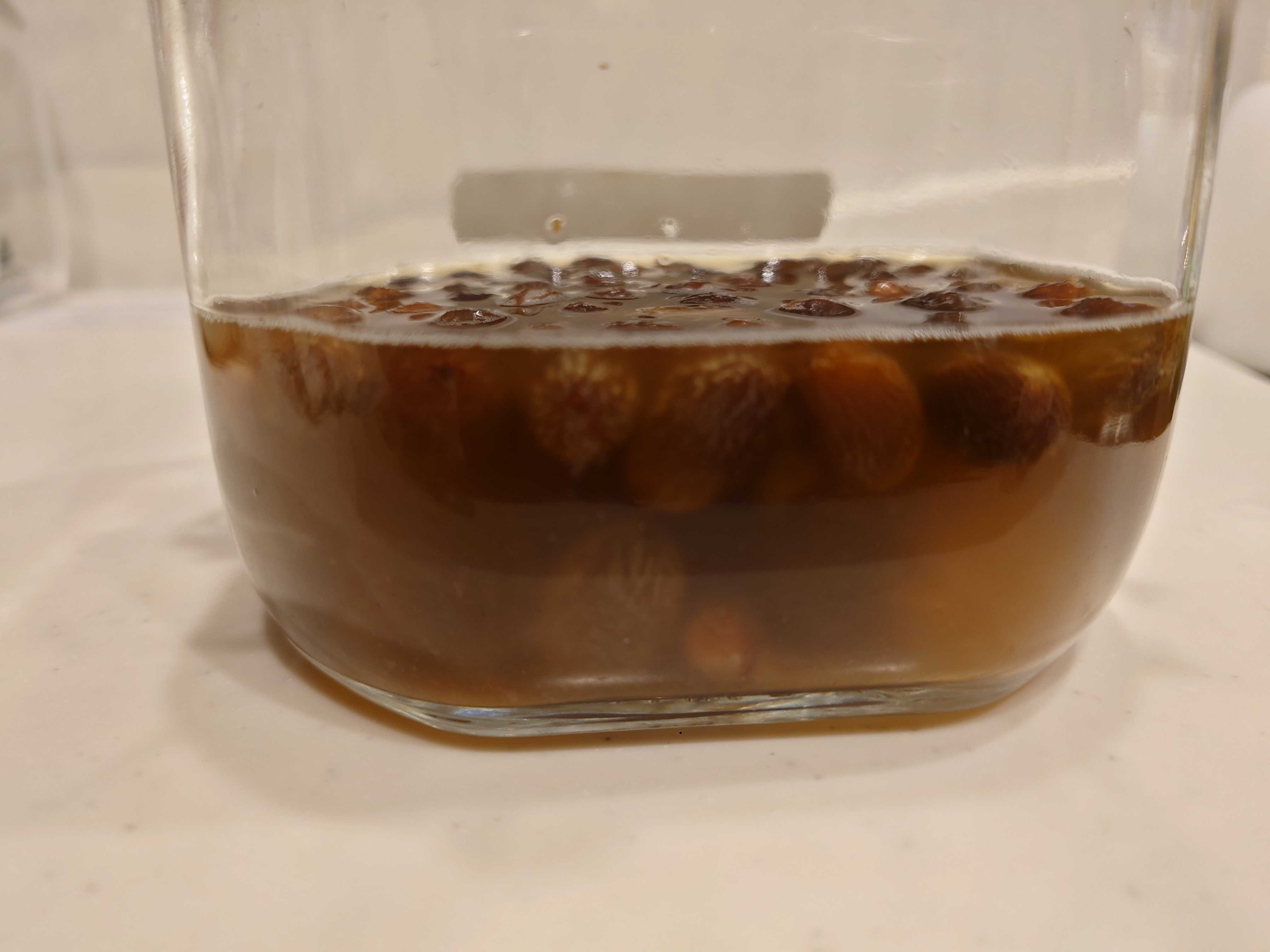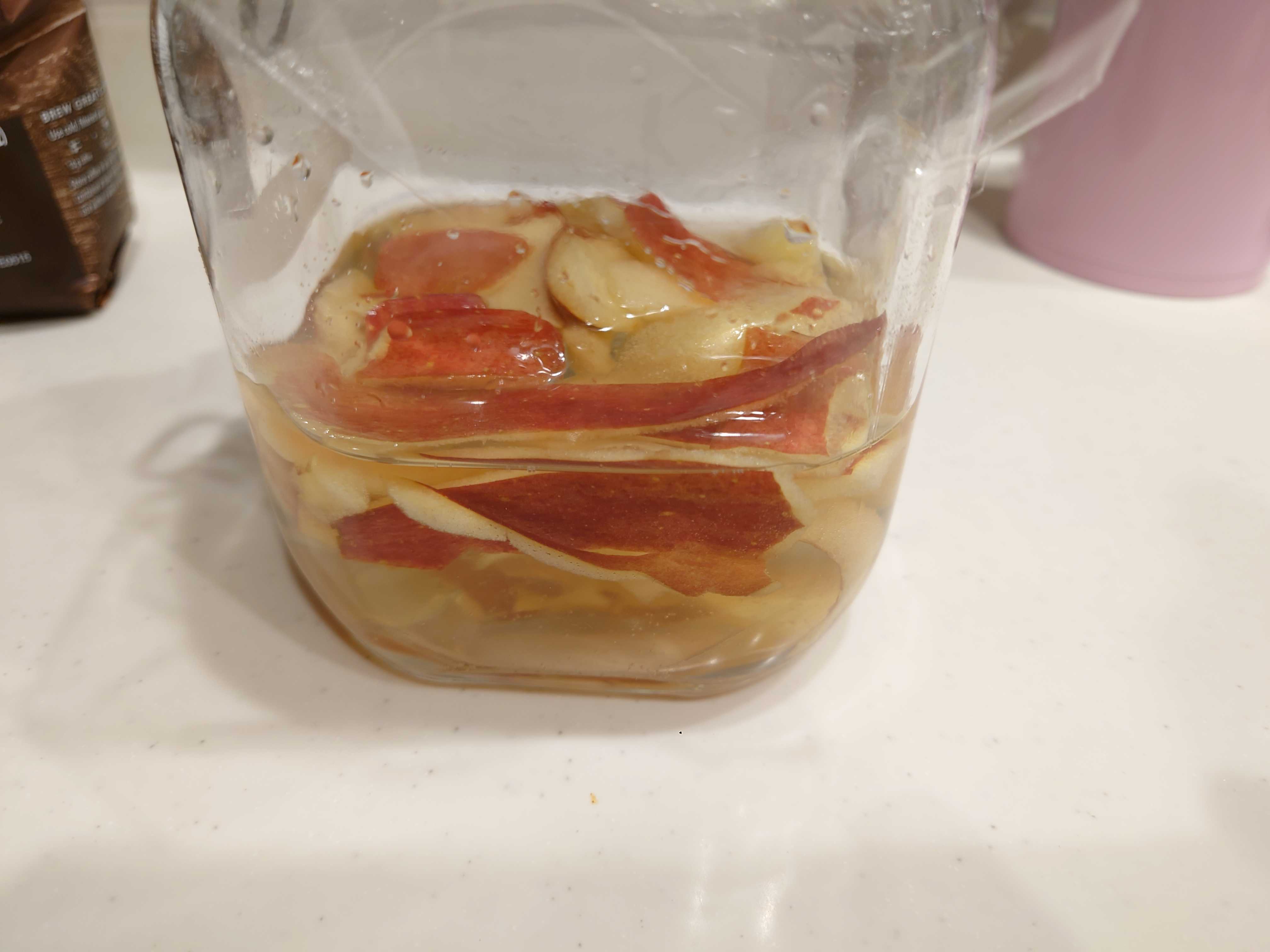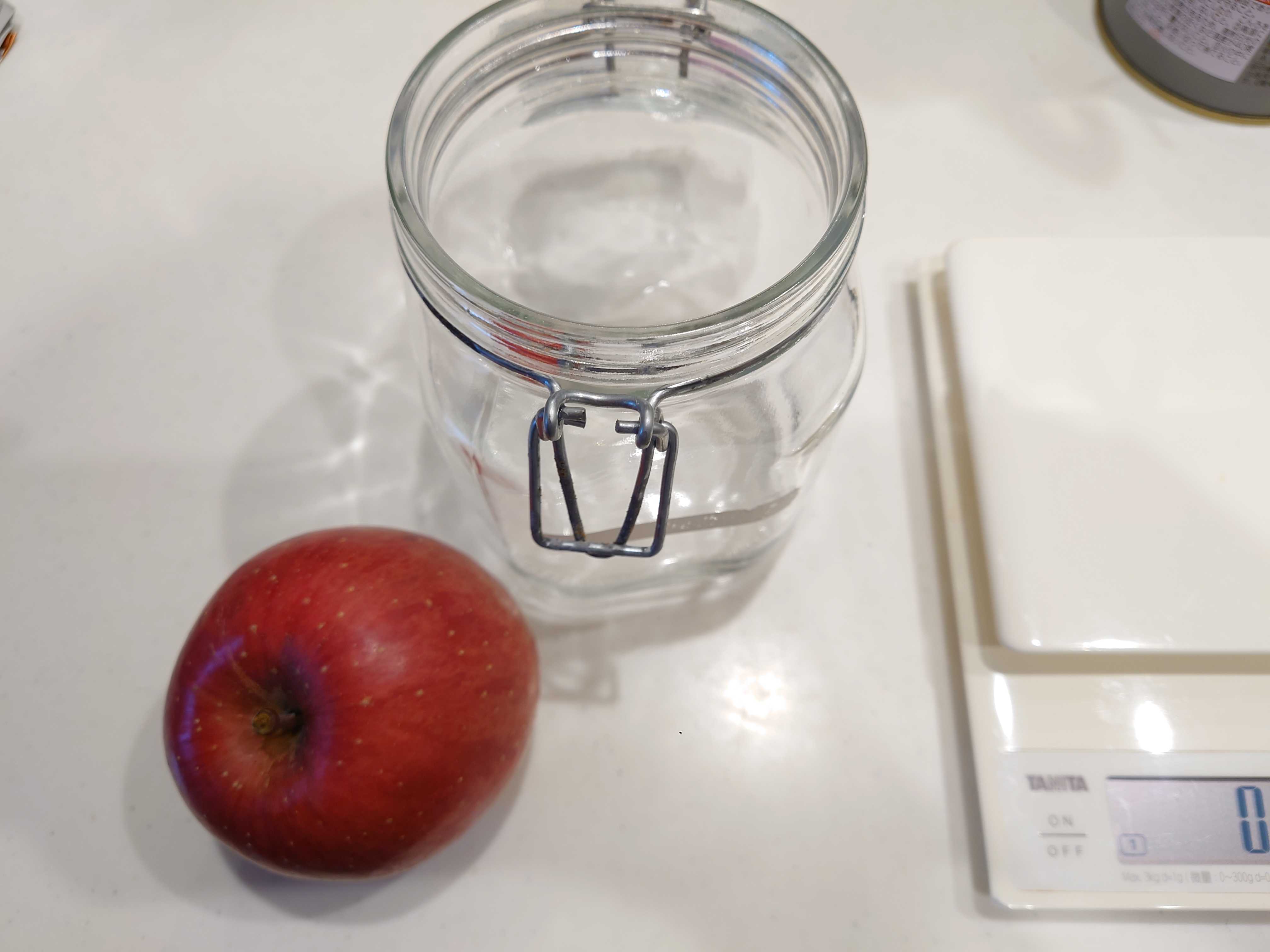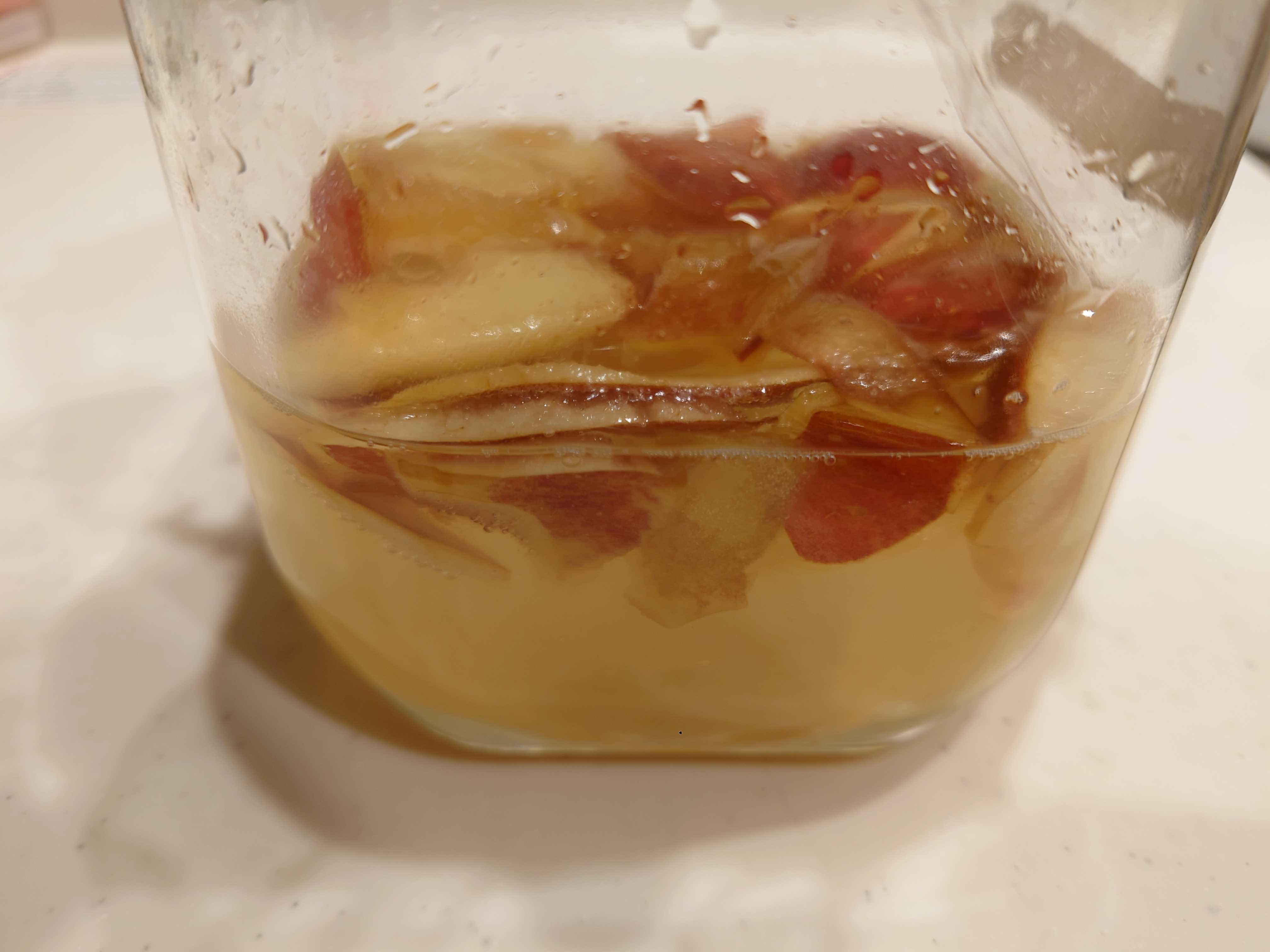 さて、2日目に入りました。たいして変化はありません。匂いもりんごの香りがほんのりする程度。朝と晩によく瓶を振り、蓋を取り空気を入れます。また、ラップをして、密封して30度前後にしてある環境で育てます。 今後に期待!