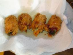 ある、無料動画サイト(グーグルの子会社)から、「林原めぐみ」で、検索したら、昔のフジTVの夕食バンザイにゲストで、登場(スレイヤーズの公開のキャンペーンかも)して、その番組でで、つくってた料理を参考に別の材料で、つくりました。材料は、豚バラ(私の代用品は、ベーコン)オオバ、チーズ(スライス、切れてるチーズ等)、明太子、小麦粉、パン粉(番組では、ゴマを使用)、卵つくり方は、豚ばら肉の細長いタイプ(薄い場合は、2枚重ねて、ください)を塩コショウをかけて、オオバを真ん中に置きチーズや明太子(オオバと同じぐらいの大きさチーズや、明太子は、平らにして、のせる)をのせ、端から、丸めていき、小麦粉、卵(私は、マヨネーズで代用)、パン粉(番組では、ゴマを使用)とから揚げの手順で、ころもをつけて、揚げます。レモン汁をつけて食べました。興味が、あれば、試してください。