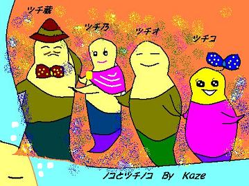 ノコは、映画の片隅にツチノコが映りこんでいた事を話した。 ひとしきり聞いた後、母がツチノコに訊いた。「ねぇ、アンタの家族構成どうなってるの?」「家族4人、父、ツチ蔵、母、ツチ乃、妹、ツチコ」 ツチノコは家族の名前を次々と挙げていった。「で、アンタの本名は?」 母が訊いた。「ツチオ」「やっぱりねー」 ノコが言った。「で、どこで家族と離ればなれになったの?」「九十九里浜、夜、ハンターいっぱい来た、みんな逃げた」 ツチノコが答えた。「えっ、映画の撮影って去年の夏でしょ。冬眠の期間も入れて、九十九里浜からこんなに早くこっちに来られるもんなの?どーやって来たの?」 ノコが訊いた。「乗った、船、銚子港」「船・・・」<つづく>-------------------------------------------------------------- 今回は、ツチノコファミリーを描いてみました お父さんをもう少し恰幅良くしたかったけど、ポーズを取らせたら細身になってしまいました。 やっぱり、4人(4匹??)一気に描くのは大変ツチノコは宿題がなくていいなぁ 今日やっと、こちらも梅雨明けしました もっと遅れるかなーと思っていましたが、去年とほぼ同じ時期。 朝から晴れあがって、昨日とうって変わって暑いです。 青いままのトマト、この陽射しで早く赤くなってね。 今夜、お祭りに行ってきます 今日は八戸三社大祭の中日で、山車の夜間運行です。 野口五郎さんと三原じゅん子さんも来る日です観られるかな?? また、フルーツパーラーで山車を待ってます。 今日の一枚は、寄せ植えの一部。 一気に増えたシソ科の赤い葉に、なんだか穂のようなものが伸びてきて、紫の花が咲きました。 これ、咲かせていいんでしょうか(^_^;)