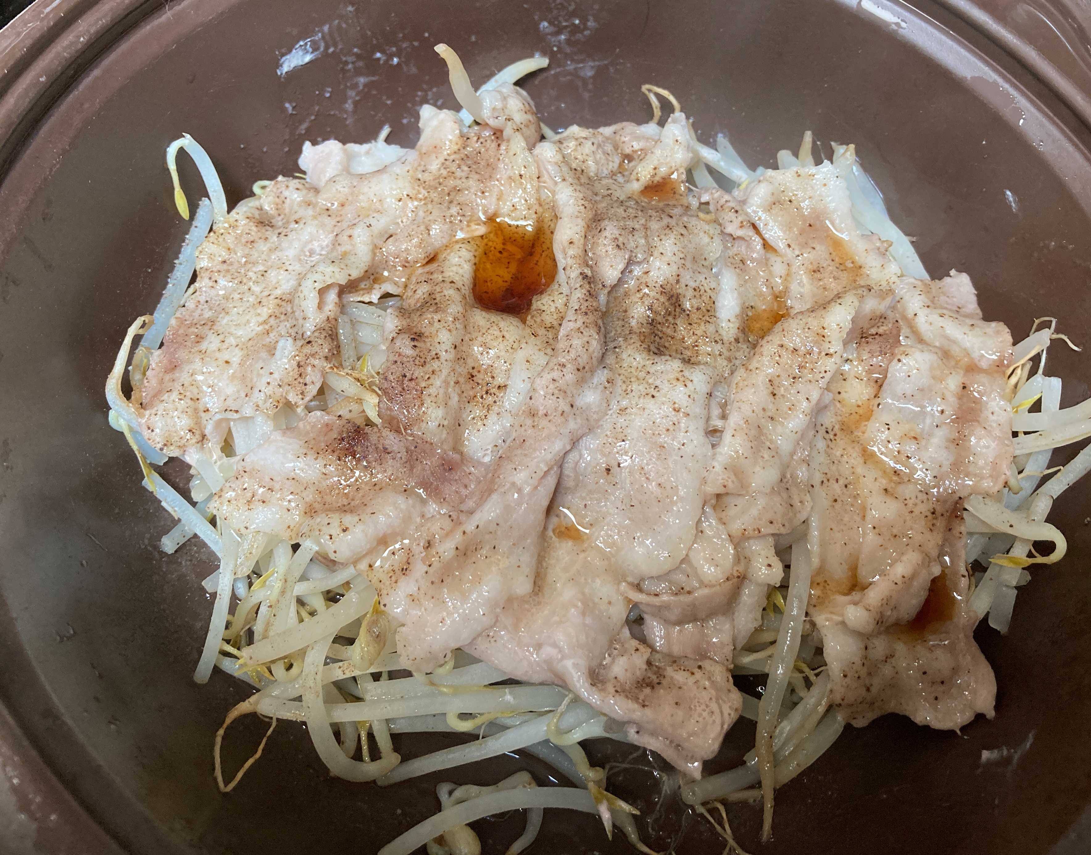 ここ数日、ミツカンのコマーシャルで、レンチンの豚バラもやしのポン酢掛けというのを見て、食べてみたいな~、と思い作ってみました。