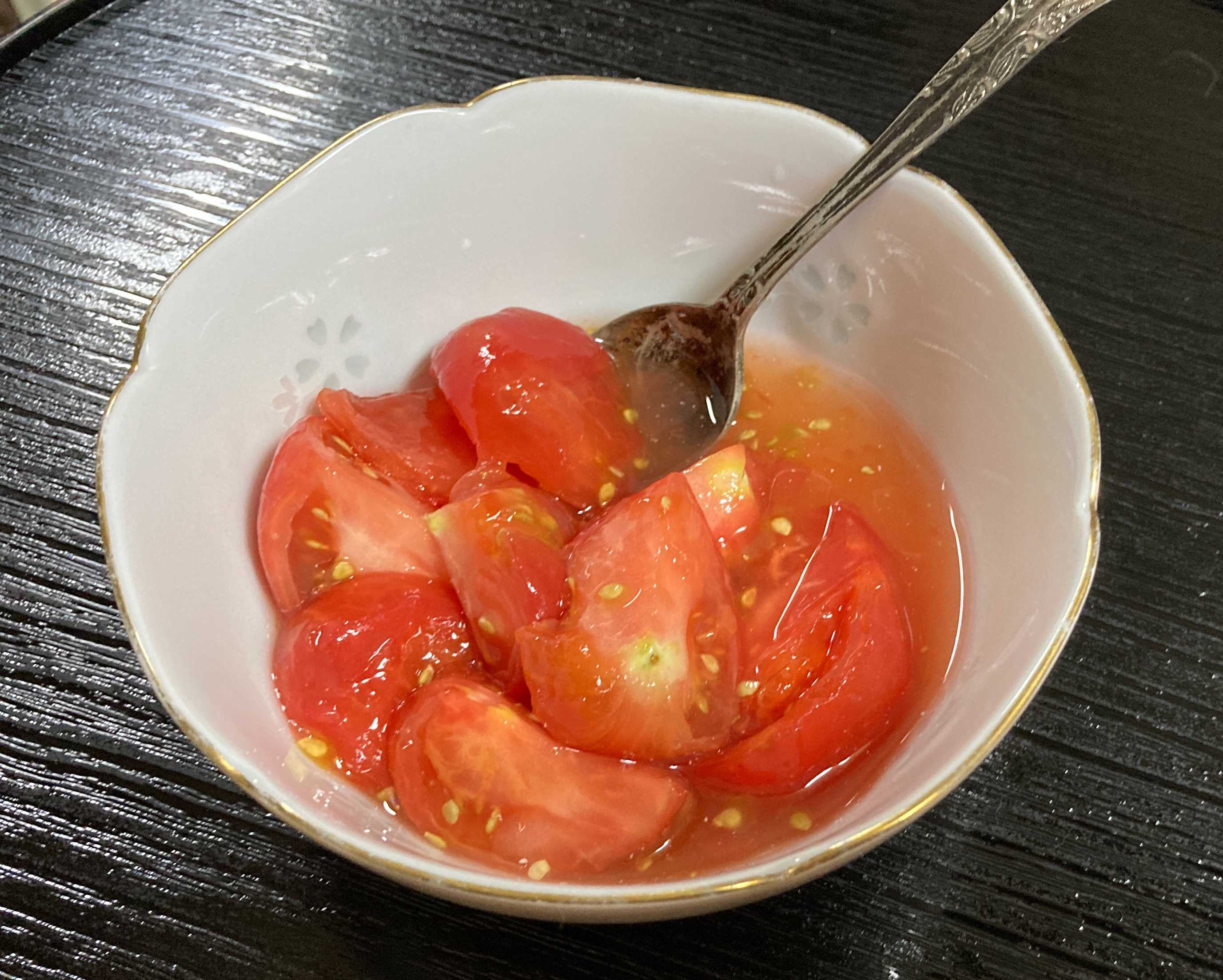 完熟トマトの皮を剥いて、砂糖をかけてしばらく冷蔵庫で冷やすと、トマトシロップが沁み出したスイーツができてます。