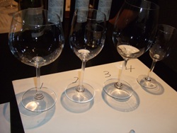 今月のお酒の会は日本のワイン 勝沼醸造のワイン会でした。 8月26日(日)12:00~14:30 天心堂(小倉北区馬借)にて勝沼醸造の大橋部長をお招きして「ワイングラスの違いによるワインの味の変化」世界的に有名なグラスメーカー「リーデル社 オーストリア」のワイングラスを使用して実際に飲み比べてみました。使用したグラスは4種類1.モンラッシュグラス ¥21002.シャルドネグラス ¥18903.ボルドーグラス ¥21004.ノーマルグラス ¥420 1のグラスにはラングドックのシャルドネ白ワイン2.3.4のグラスにはアルガブランカ クラレーザ(甲州、白ワイン)皆さんには何種類のワインがグラスに注がれているかしっかりと味わいながら飲んでいただきました。2種類と答えられたワイン通の方もいらっしゃいましたが答えはいろいろ。五感を働かせて飲んでみるとまさしくグラスの形状によって味が違いました。アルガブランカ クラレーザにはシャルドネグラスが一番おいしい!!アルガブランカ ピッパはモンラッシュグラスが抜群!!新たな発見にグラスの重要性が理解できました。いいグラスは価格もいいけれどそれなりの価値があります。グラスにもこだわりたいですね!
