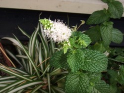 何気なく頂いたミントと花の種夏の暑さに負けず生き生きと葉が育ち花がつきました。ミントは「この茎を挿しておくとすぐ付くよ。 香りはいいし、ハーブティができるよ」といただき、植木鉢にさしたところ、ぐんぐん育ち小さなかわいい花が咲きました。初めて見るミントの花、小さな花びらがたくさんカメラでパチリ!!ねっかわいいでしょ。葉をつむとミントの香りがさわやかに香ります。花の種は春ごろにこれも頂き物お酒のたるに土をいれてぱらぱらとまいただけそれがいつのまにか芽がでて紫色の花が咲きました。「これ何の花だったっけ。」残念ながら名前がわかりません。じっとみてるとありがたくさんよってきています。「おいしい花かな」と思いながらはいパチリ!!自然の力に感謝しながらでもこの暑さでは自然の力をたよりにしていたら枯れてしまいます。花たちにも愛情が必要毎朝の水やりが看板娘の日課です。