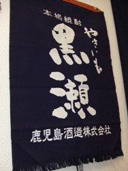 お盆に入り街の流れがのんびりとしているようです。テレビでオリンピック水泳の200M平泳ぎの北島選手を応援!!画面にむかって「いけ!いけ!!」と声援。金メダル、やった~!!店内には焼酎蔵や日本酒蔵の前掛けが貼ってあります。各蔵元の看板酒のラベル字体で書かれてあり個性が光っています。今回の前掛けは 「やきいも 黒瀬」焼いた芋を仕込んで作るので焼き芋の香ばしい香りと芋の甘みが広がります。夏はロックで冬はお湯割りで大人気の芋焼酎です。黒瀬の字、少し丸みがあって温かみを感じます。味にも表れているようです。鹿児島酒造の人気芋焼酎の一本です。