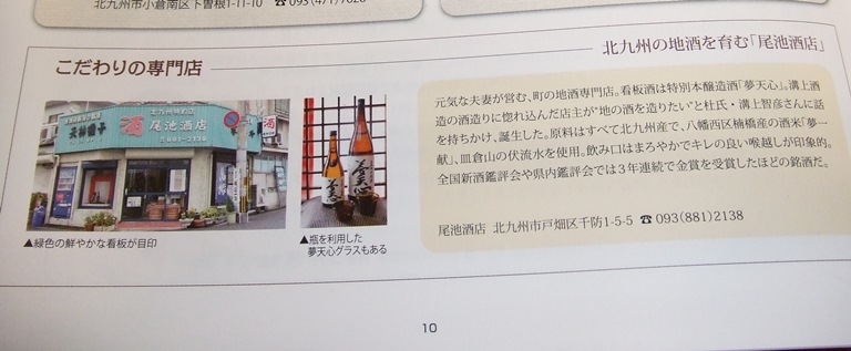 北九州の健康情報誌「あんしん通信」2014年NO.015に尾池酒店がカラー写真入りで掲載されました10ページを開くと こだわりの専門店 北九州の地酒を育む「尾池酒店」店頭の写真がばっちり「北九州の地酒 夢天心」と夢天心グラスの写真もありますよ記事に目をやると最初の出だしがいいですね~ 『元気な夫妻が営む、町の地酒専門店』そう、ピッタシです!!尾池店長と看板娘の元気良さは戸畑一元気と笑顔が取り柄の二人です地元を愛しお酒に惚れお酒が大好きな酒屋です取材を受け、素晴らしい文章と写真に感謝の気持ちでいっぱい!ありがとうございました