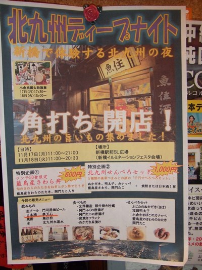 新橋駅前SL広場で北九州の酒文化 角打ちが楽しめますッ!!11月17日(月)11:00~21:00 18日(火)11:00~20:302日間、バッチリと北九州のお酒と食材をご用意して角打ち、開店~日本酒はもちろん「北九州の地酒 夢天心」当店のお酒が選ばれました~えっへん!北九州を代表する地酒に成長しましたねぇワンダフル!!このおいしさ、味わって下さいね門司港地ビールや小倉の粕取焼酎「無法松」もありますよ尾池酒店でお取扱いしてるお酒たちです食べ物も北九州特産品が盛りだくさん気になる「北九州せんべろセット」は千円で5種類のおつまみとお酒つき千円でベロベロにころっといちゃいますよ~看板娘が登場と行きたかったのですが北九州 戸畑からの応援となりましたぜひぜひ、新橋駅前SL広場で「北九州の地酒 夢天心」を楽しんで下さい~ 「よろしくッ」