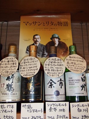 朝ドラ「マッサン」に尾池店長と看板娘、夢中になってま~す日本で初めてウィスキーを造った物語りとあって放映前から話題に特に酒類業界では力をいれてアピール尾池酒店「マッサン」コーナーを作りましたッニッカウィスキー 竹鶴 17年 ピュアモルト 竹鶴 ピュアモルト シングルモルト 余市 10年サントリー 白州 シングルモルト厳選して4アイテム「夜を楽しむ 大人の酒」としてお勧め中看板娘もロックにコロリっ竹鶴 17年香りとすきっとしたコク初めてのウィスキーでしたが食後のひとときをゆっくりとチョコレートをつまみながら頂きましたまさに「大人の味!!」これから、ウィスキーの勉強だ~と張り切っております