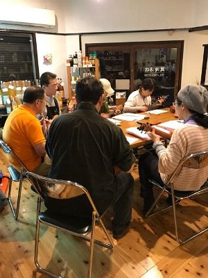 あっという間の1ヶ月昨晩は月1回のウクレレ教室の日でした尾池店長はウクレレ持参で出勤朝からニコニコ顔です(^^♪先月の曲「パレード」を復習山下達朗いいですね~♪看板娘はコンサートに行くほどのファンCDも持ってますよそうだ!店内でかけようかな尾池店長はのレッスン姿は毎回登場ですが看板娘はと言うとウクレレ演奏を聴きながら雑用昨晩は4月8日に出店する小倉北区紫川でのワインバル「紫川TERRASSE」のワインのリストアップと店の紹介などを~ 尾池酒店のショップカードセレクトしたワインまだまだいるねウクレレを聴きながらいい気分で仕事がはかどりましたよウクレレレッスン終了後は皆さんと一緒にお酒タイムこちらは参加してワイワイガヤガヤ今回も楽しいレッスンでした皆様、有難うございました