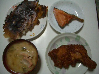 他には フライドチキン 鮭の粕汁 と、余った を焼いた 鮭の塩焼き