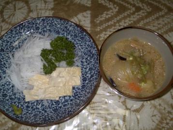 今日の夜ご飯は、ゆばのさしみとおぼろとうふの冷やっこに始まり、せりのおひたし、しょうゆ豆(同僚が高松のお土産に買ってきてくれました)。それから、かにしゅうまい(これも同僚が横浜から買ってきてくれたもの)。そして、すき焼きの牛肉だけのもの。これが何しろおいしくて、お肉とタレをご飯にのせて食べると、多少お腹が苦しくても、どんどん食べることができちゃうんです。今日のお肉はすき焼きやしゃぶしゃぶ用ではなく、焼肉用でしたので、おにく~っていう感じで、かみごたえがありました。それを、ごっくん!と飲み込んだときの、満足度。喉を押し広げて通っていくお肉のおいしさ!いつのころからか、牛肉を食べるときにはこんなふうに食べるのがおいしいと感じるようになっちゃいました。写真は、ゆばのさしみと、お汁(実はこれ、くじらとみずが入ったもの。今回は、インターネットでみつけた作り方で、具沢山の味噌仕立てにしたものなのです。じゃがいもやたまねぎ、にんじんなどは、おいしいと思いましたが、くじらはやはりまだ無理みたい…) デザートは、「イエローキング」というメロン。名前がすごいので、中身が黄色いメロンかと思っていたのですが、中身は白い果肉で、ハネジュウメロンに味も似ていました。すっきりした甘さで、おいしかったです。