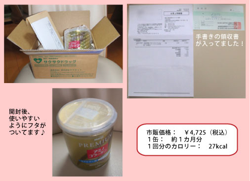 アミノコラーゲンプレミアム購入最近、気になりはじめたお肌のたるみ、ほうれい線リフトアップをうたう美容液を試してみたけど、効果はいまいちアミノコラーゲンを飲んで、めざせ藤原紀香(←ムリムリ) ★ 2月7日発注、指定した15日の朝届きました (配達希望は10日から可能でした) ★ 今回の購入価格 ¥3,645 (税込・送料¥0) ★ 賞味期限: 2011年2月28日 早速、アミノコラーゲンプレミアムを飲んでみました ● いつも飲んでるスティックタイプのコーヒーにアミノコラーゲンプレミアムを入れてTRY。 味はやっぱり少し変わった気がするけど、「気のせいかも!?」と思える程度です。 ● ストレートの紅茶にアミノコラーゲンプレミアムをいれたら、色が少しにごった。 甘さがないと紅茶の味が負けてちょびっとだけ違和感がある 砂糖やミルクが入ってる方が味の変化を感じないかも ● プロテインとアップルジュースの相性がものすごくよかったので、 もしかするとアミノコラーゲンプレミアムもアップルジュースと相性かも ● アミノコラーゲンプレミアムの入れ物は金色の缶なのに、缶裏側の説明書きの字が 薄いグレーなので目立たない。老眼が入ってるレイには辛い 今回アミノコラーゲンプレミアムを購入したお店がこちら賞味期限間近の商品をさらにお安い!要チェック!!!送料別の場合も送料¥315と比較的お得!!! こちらのショップ&アイテムも要チェック!!!こちらも送料¥315と比較的お得!アミノコラーゲンプレミアムでプルプル肌になるぞ