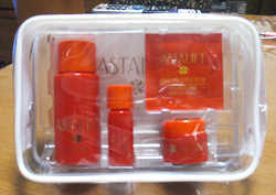 ASTALIFT(アスタリフト)が届きましたCMで聖子ちゃんと中島美由紀さんがハリーさん、ハリーさん! 人の名前じゃないんですぅぅぅ~~ と歌いながら宣伝してる化粧品ASTALIFT ★ ASTALIFT(¥1000、税込・送料込)のトライアルキットが今日届きました最近、いろいろな化粧品のトライアルキットを試しているのですが、ASTALIFTが他とちがうところは、A6サイズのわかりやすい使い方カードが付いてきたところ。このASTALIFTってFujiFilmの製品て知ってました?フィルム技術を応用して開発した、独自のナノテクノロジーを駆使して出来上がったのがASTALIFTだそうです。(詳しくはこちら...)最近、多いですよね、意外な会社の意外な製品。以前、取り寄せたageless(アージュレス)もオリンパスグループの会社ヒューマラボの製品でした。ASTALIFTもagelessも「リフトアップ」を期待できる化粧品コラーゲンが減少し始めて、もうしばらく経つレイにはもってこいの化粧品先日のアミノコラーゲンプレミアムと一緒に使って、相乗効果を狙おうめざせ藤原紀香(だから、ムリだっつ~の)