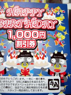 家に帰ると、こんなハガキが着ていた。ちょっと早いが、「Happy Birth Day! 1000円 割引券」しかしながら、最近牛角って行った記憶ないけど、まっ気にしない、気にしない。プレゼントって言うんだから、行くべ!って盛り上がりは一瞬。裏を見ると「牛角横手店 のみ有効です」って、横手店って?秋田県横手市でねぇが?よく考えたら、1月横手出張の打ち上げが牛角だった記憶が・・・。ま、大体こんなオチである。