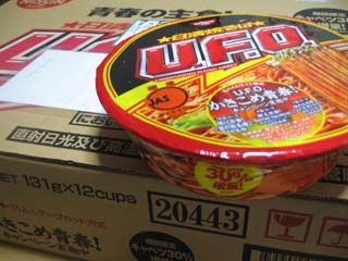 夕食時、こんな物が届いた。かみさんからは「ゼッタイ!禁止令」が出ているヤツ。どうしても押さえられない衝動に駆られた時は、出張先のホテルでこっそり喰らうのである。そんな私にとってのタブーが、1ケース。しかも佐川のオジサンが、笑顔で「ハンコお願いします」ですよ。受け取る私も笑顔ですよ。一瞬、私の密かな好物を知っている誰かからの、かなり早めのバースディプレゼント?お中元?ま、とにかくかみさんには隠しておきたいような、それでもこのサプライズを共有したいような、まずは、差出人チェック。「フィット・・・? キャンペーン・・・?」とりあえずスキップでかみさんに見せると、「あーーぁ、外れちゃったのね。がっくし」私と娘とは対照的に、えらい落胆ぶりである。答えは「懸賞」であった。「HONDAのフィット」を狙ったらしい。「おまえさぁ、当たっちゃったら今乗ってるモビリオどおすんのさ?」「そんなの、当たったフィットはすぐさま転売するわよ!」ふぅーん。しっかりしてんなぁ、と呟きつつ私と娘は箱をべリべリ破っている。確か、普段はくじ運の悪いはずのかみさんである。「UFOで運を使い果たしちゃった」とやはり落胆している。私と娘にしちゃ、おかまい無しに大当たりなのだ。カップめんは禁止!ってたってねぇ。台所でヒッソリ佇むUFOの箱。この時間PCなんかに向かってると、もの凄い腹が減るのである。もの凄い葛藤なんである。「一個減ってもわかんないし・・・」「いや、太るし・・・」「明日走って、消費したらいいし・・・」とっとと寝ちゃえば済むのである。でもね・・・寝るべし。