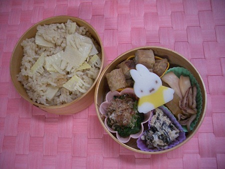 こんばんは~今日は久々にお弁当日記です半年以上ぶりかな今日のお弁当~CIMG4111 posted by (C)ティラ★筍ご飯★鶏つくね★イカ大根★ひじきとツナ、玉ねぎのマヨサラダ★ほうれん草のお浸し★MIffyかまぼこでした筍をいただいたので筍ご飯にしてみました~美味しかったです*sae*