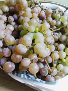 今年もお友達のお庭に葡萄が実りました。=戴きましたご主人と二人で仲良くもぎ取ってくださったようですが、朝夕は涼しくなりましたがまだまだ日中は暑いので、申し訳なかったです。結構ズッしりと感じるぐらいの量をいただきましたので、一粒ずつ外して洗い、ざるに上げるのにも約30分はかかったかな??昨年作ったので大まかな流れは分かってます。私のいい加減な性格でしょうか??適当な分量で、ヨーグルトソースを作ってます。お砂糖は一袋=1kg、ボンとお鍋の中に。レモン汁=1個分白ワイン=適量、ドボドボっと・・・。 赤ワインのほうが色が綺麗に仕上がったかもしれません)りんごの絞り汁=買い忘れたため入れてません。きっと美味しく仕上がるでしょういつもありがとうね~