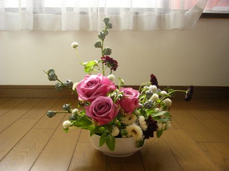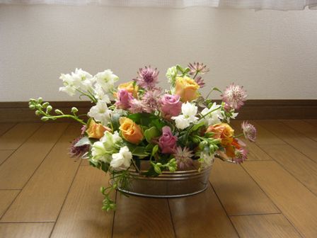 次回 1day体験レッスン 11月24日(木)AM10:30~ 締め切りは 11月16日!! ご連絡お待ちしてます♪__________________________________________________________________________________________________________________________________________昨日は、自宅の教室で初のフラワーアレンジメント体験レッスンでした。生徒さんは、どうしてもお子様連れご希望とのこと!今回は参加者が一人だけだったので、お子様連れで参加していただきました。フラワーアレンジメントは全くの初心者とのことでしたが、とってもセンスがありお上手でした!まずお花の扱い方など基本的な説明だけして、自由にアレンジして頂きました。最初はその説明だけで、何をどうしていいのかわからないご様子でしたが、そのうち「素敵!」とか「かわいい!」と自画自賛の声が聞こえ、積極的に質問も飛んできました☆私は、こんな反応を待っていたのです♪♪♪数箇所のアドバイスだけで、驚くほど素敵な作品ができあがりご本人も大喜び♪私も本当にビックリしました!お子様も一人でおとなしく遊んでいてくれました。2歳の男の子だったのですが、途中からお母様の隣のイスにちょこんと座り、興味津々に見ていました♪今日は生徒さんの作品をご紹介します!昨日紹介したギフトのバースデーアレンジとほぼ同じ花材なのですが、なんだか私より素敵?!?!?!O・Yさん、またのご参加、お待ちしていますね♪オアシスを逆さまにして、もう一度アレンジの練習してみてくださいね!初の自宅レッスンだったので、記念に撮らせて頂きました。カメラを向けると少し緊張?!「手元しか写さないので大丈夫ですよ!」(笑)