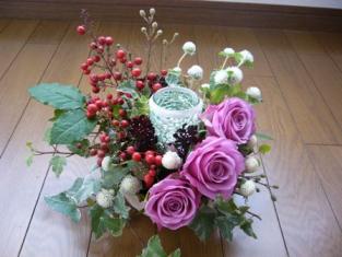 今日はお客様のご希望で、ギフト用にキャンドルアレンジを作りました。60代のお母様のバースデープレゼントとのことでした!今回のお客様は、私の知り合いだったので、感想をお聞きすることができました!お母様は「このバラ私の好みだわ~♪」ととてもお喜びになり、キャンドルも珍しかったらしく、点けるのを楽しみにしていたそうです!喜んでいただけて、とても嬉しいです♪受け取った方の感想が聞けると、安心しますよね!バラ(クールウォーター)・ユーカリクロボラス・千日紅・スカビオサ少し暗くして、キャンドルを灯して撮ってみました!(ちょっと暗すぎたかな?!)もちろんキャンドルはお取替えしましたよ♪アップです↓