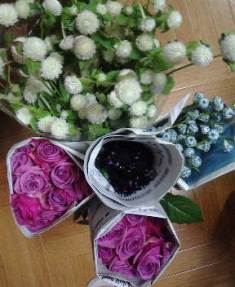 今日は朝一番に、お客様がアレンジを引き取りにいらっしゃいました!ご注文いただいたお客様は、若い男性営業マン!贈る方は取引先の院長さん(女性)だそうです。お花のことは何もわからないそうなので、「お任せ」でご注文を受けていました。その女性のお話を伺うと華やかな方のようだったので、渋すぎず甘すぎずシックな感じで少し華やかにアレンジしてみました!お客様にアレンジを渡すと、「何て言うお花なんですか?」と全ての花材の名前を聞いて手帳にメモされていました!院長さんは以前フラワーアレンジメントをされていてお花にとても興味がある方なので、花材の名前も伝えたら喜ぶのでは?!と思ったそうです。真剣だったので、私も品種まで教えてあげました。後ほど、わざわざお客様からお礼のお電話が入り、アレンジメントもお花の名前を伝えたことも、大変喜んでいただけたとのこと!気になっていたので、わざわざお電話いただいてすごく嬉しかったです♪それにしても、とても気の利くお客様でした。きっと取引先の方にも気に入られているんでしょうね♪ バラ(カラメラ・ラビンダ)、アストランチア(ローマ)、ラクスパー、ユーカリスタビライザ