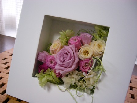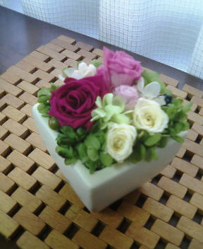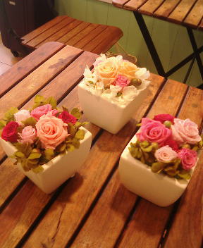 先日20日のカフェレッスン中、Kopeさんにいらしていたお客様がプリザーブドフラワーにとても興味津々生徒さんもまだ揃わず、私も手が空いていたので色々説明していましたら、「お店にいつも飾ってあって、ずっと欲しかったのよ!今買えるの?!」と、その場でご注文いただきました実物を見て気に入っていただけるのってとても嬉しいですよねレッスン用に持ち込んでいたローズがたくさんあったので、その中からお好みのお色を選んで頂き、レッスンと同じ花器でご注文♪ レッスンから帰ったあと家でじっくり作成し、Kopeさんにお預けさせて頂きました本当にありがとうございました少し年配のおばぁちゃまでしたそうそう、Kopeさんって若い女性のお客さんももちろん多いのですが実はおばぁちゃまの常連様も多いんです!!きっと、マスターのお人柄でしょうね