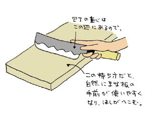 たいていの人は柄の端を持って、刃の先のほうで切るので、まな板の真ん中がへこむことになり、葱やたくあんが