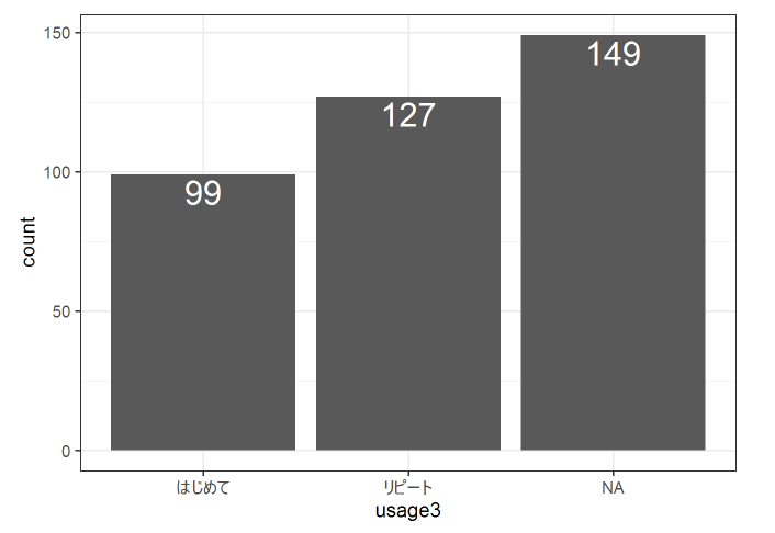 スクレイピングした項目のグラフを作成しようとして、取り込んだテキストの空白の処理がうまくいっていないことがわかりました。例えば、「購入した回数」の項目で、「リピート」と「はじめて」の件数をグラフにしてみましたが、下図のように酷い状態であることがわかりました(涙)。